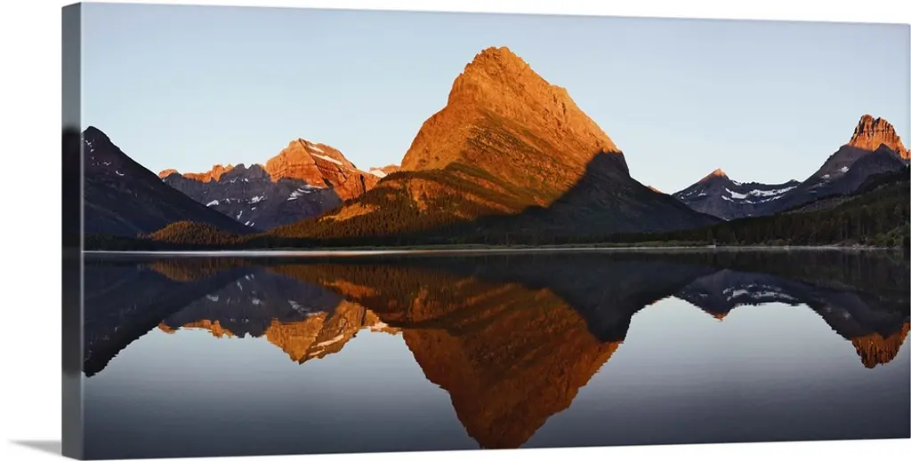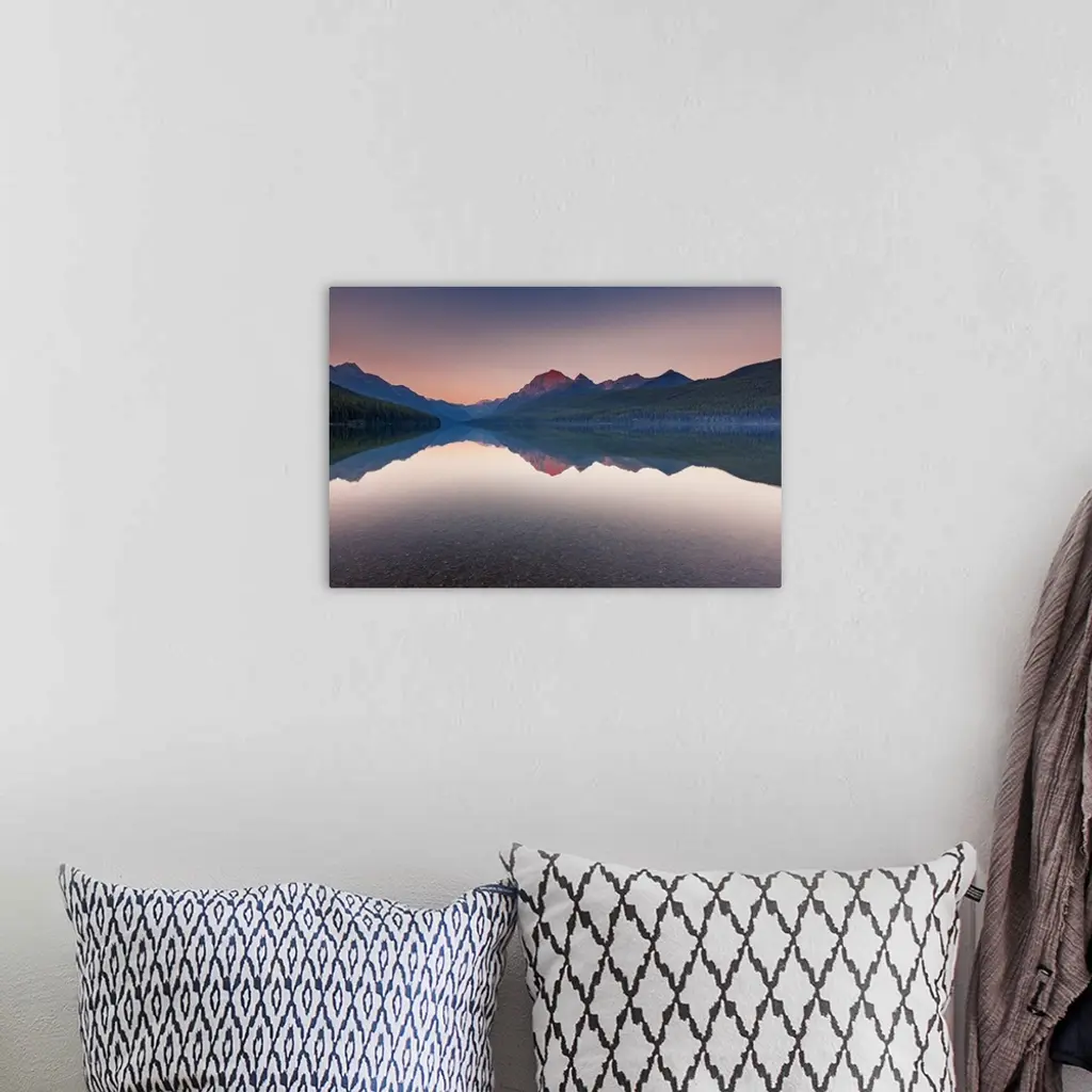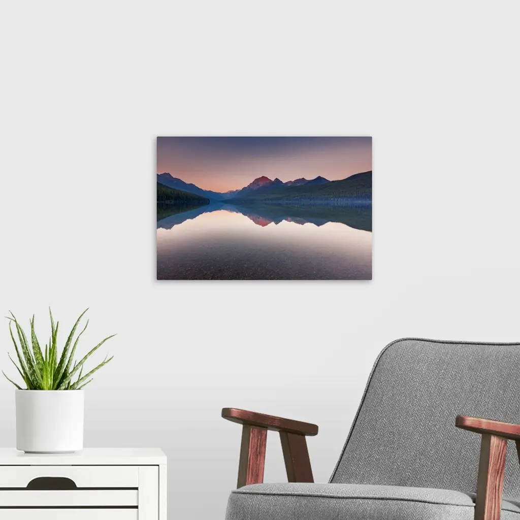 Peaceful Bowman Lake in sunset at Polebridge, Glacier National Park, Montana.