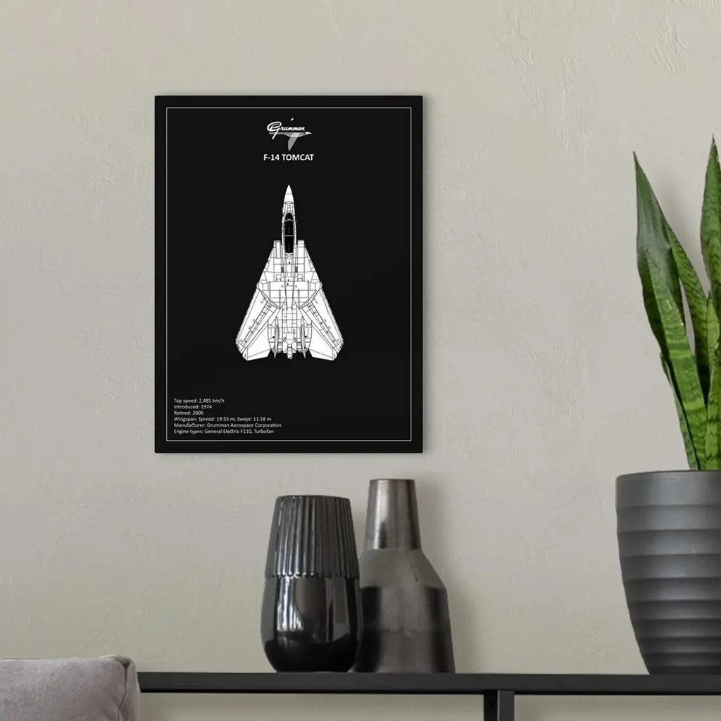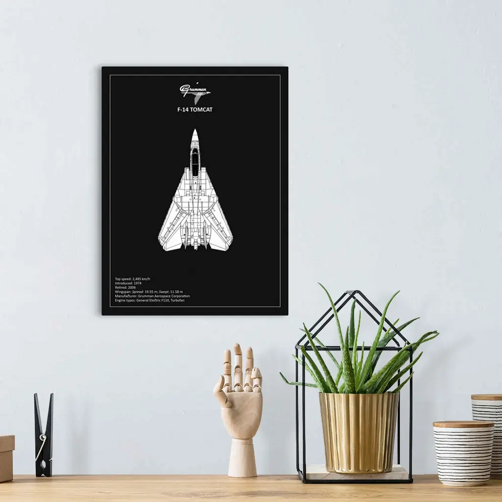 Black and white diagram of a BP F-14-Tomcat with written information at the bottom, on a black background.