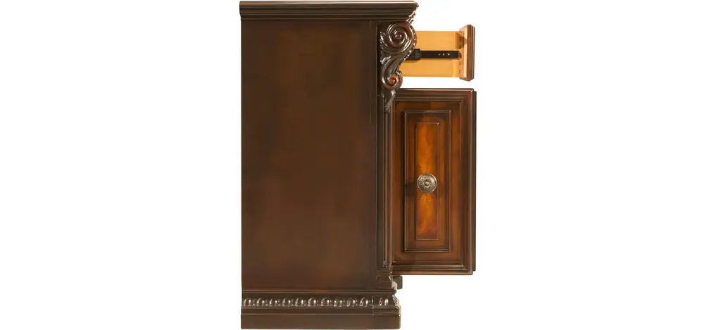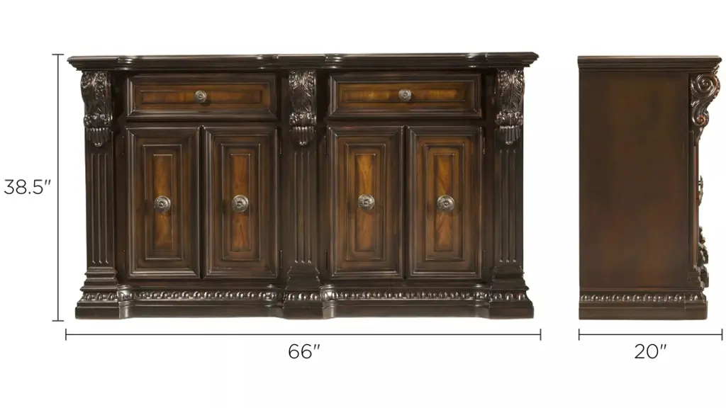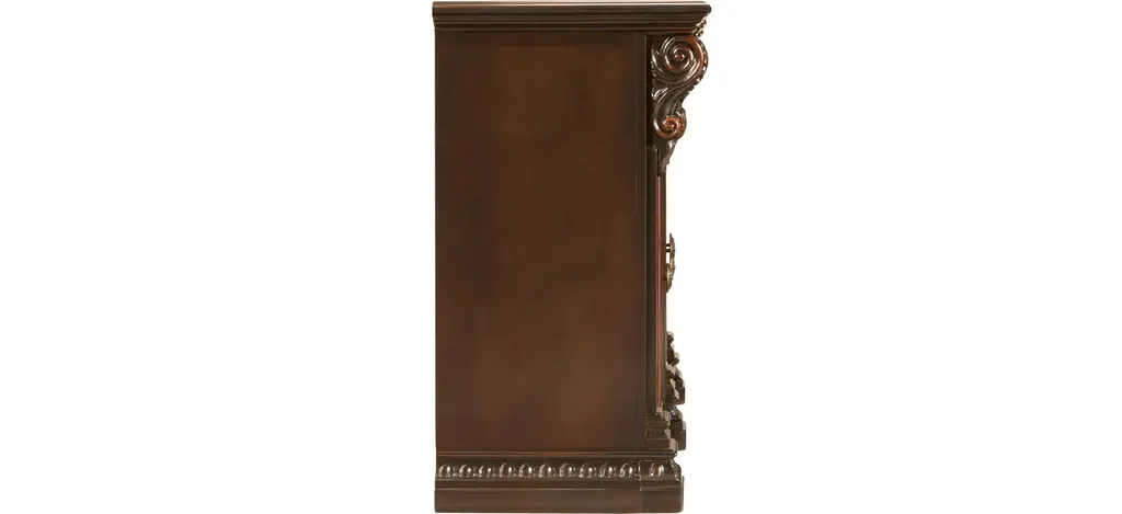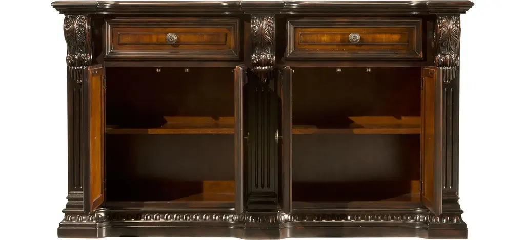 Make a statement in your traditional decor with the Bradford Heights server. The stunning beauty of this formal dining piece is something you'll cherish every time you sit down for a meal. Cathedral pattern veneers, two-tone finish, intricate wood carvings and dark bronze hardware complete this classic look.