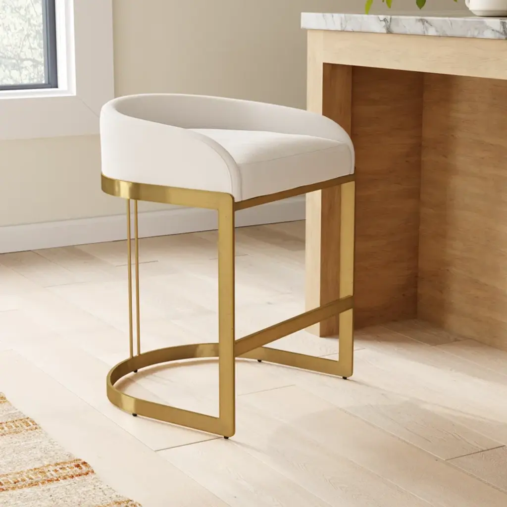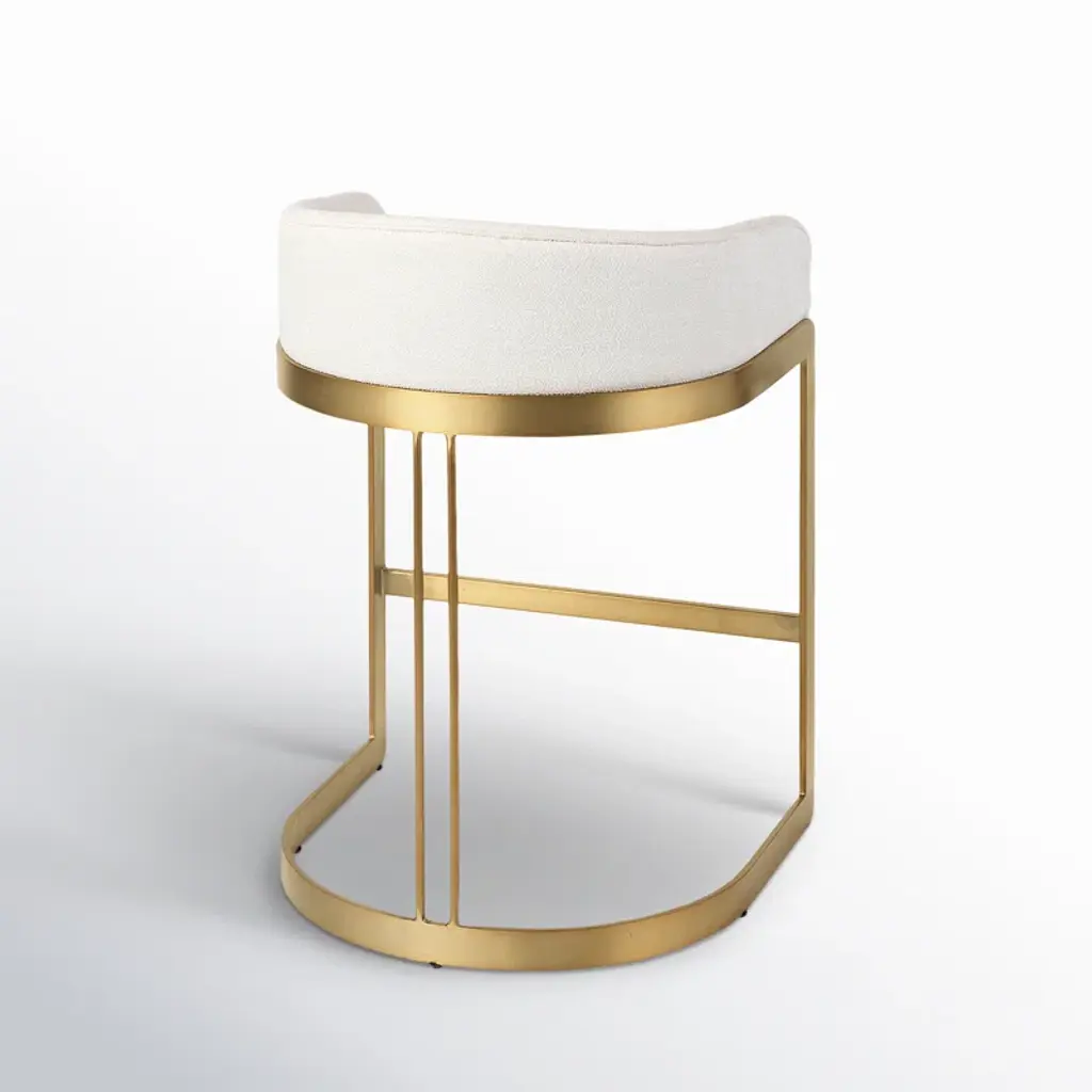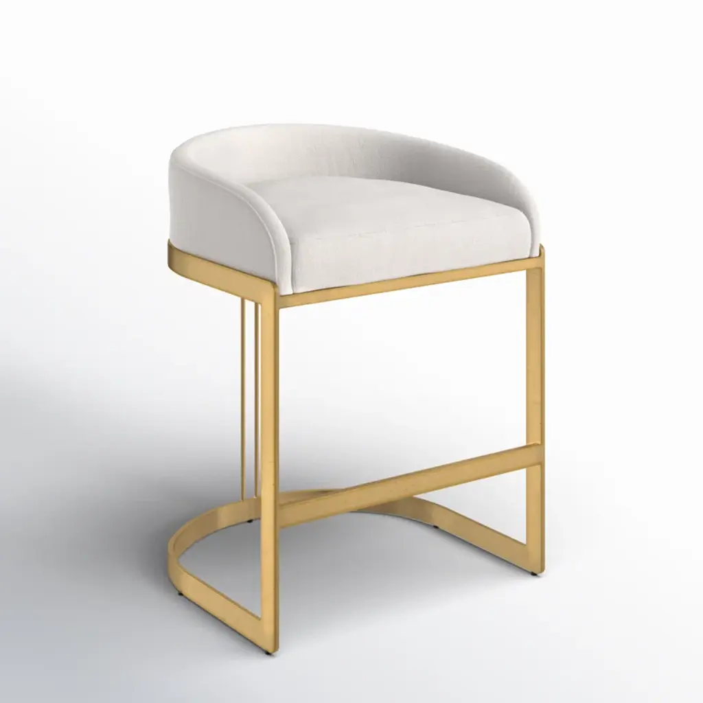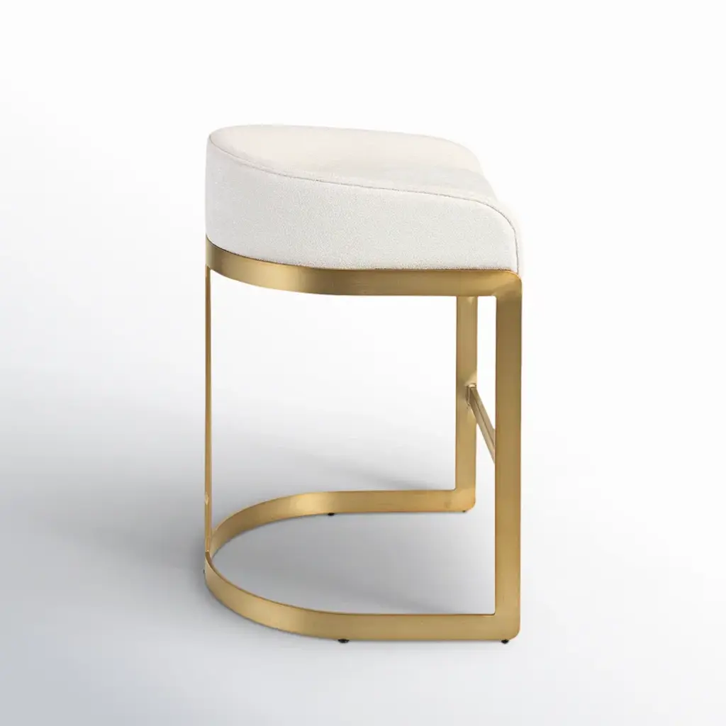 Pull up a seat. Our low-back stool is wrapped in neutral-toned upholstery, and it features a sled base crafted from metal with a distinctive finish. A brace in front serves as a footrest, while the bucket seat provides extra support. Plush foam padding adds another layer of comfort to the design.