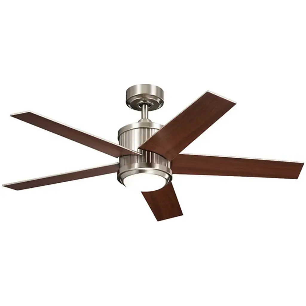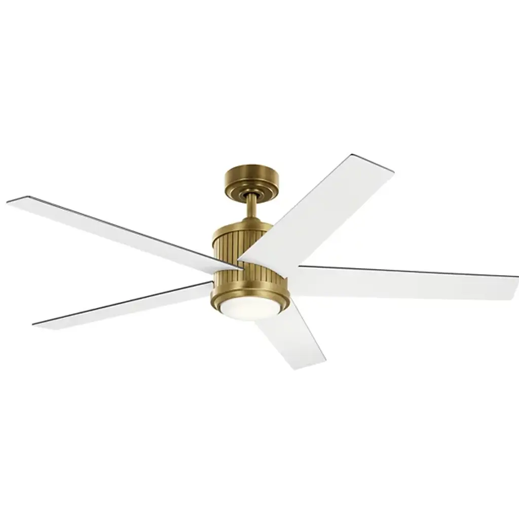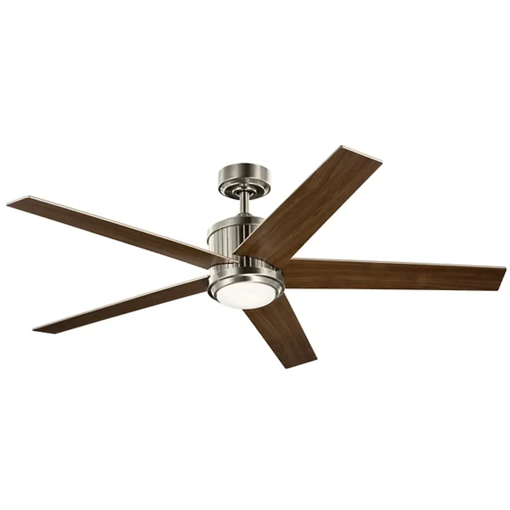 Play a symphony of style in your indoor living spaces with the subtle, stylish lines of the Brahm LED Ceiling Fan from Kichler. A stylish sample able to work well with a range of décor styles, it’s suspended from a circular canopy and short downrod, and inspired by a wooden table from Texas, uniquely styled with a vertically ribbed central housing. Five slender, wide-reaching blades extend outward from a central housing set around its motor and lamping, while an integrated LED lamp blasts out through a diffuser of satin etched opal glass to provide a soft wash of elegant downlight.