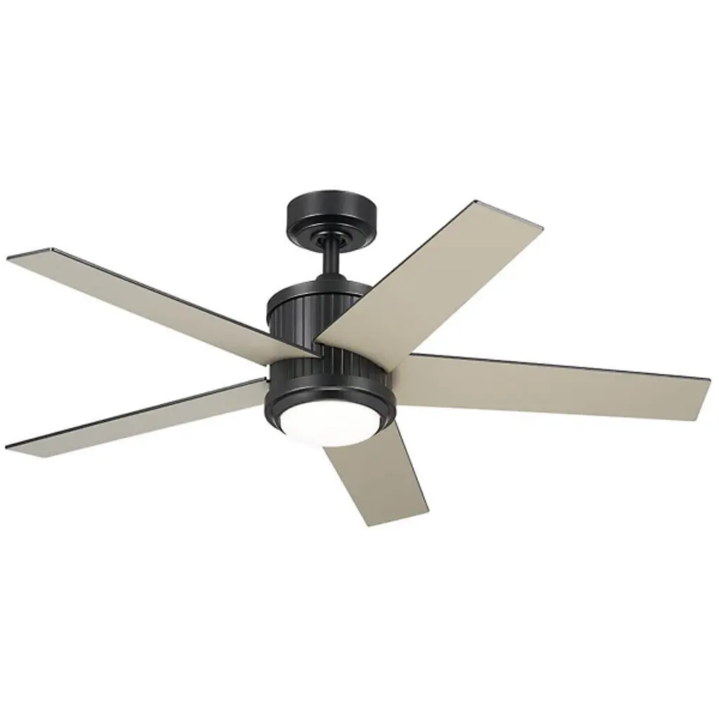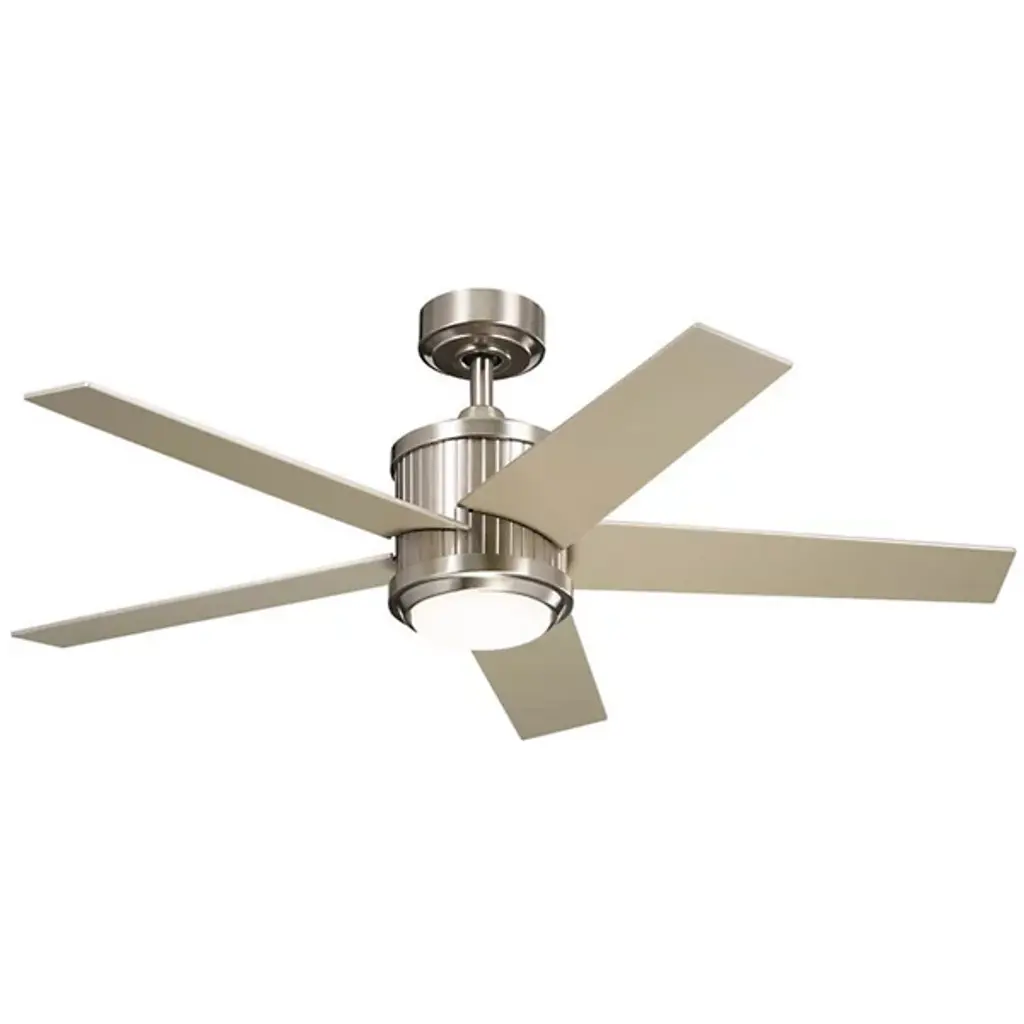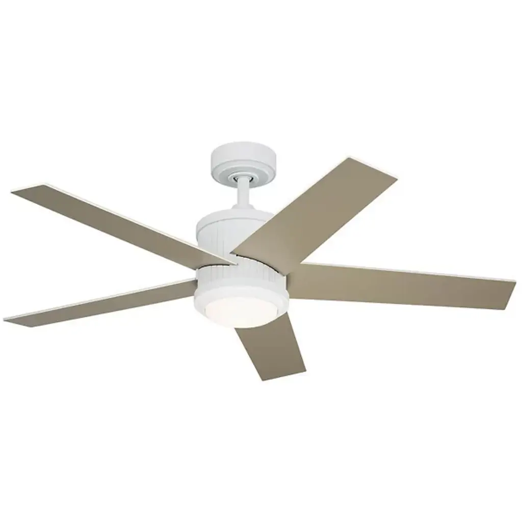 Play a symphony of style in your indoor living spaces with the subtle, stylish lines of the Brahm LED Ceiling Fan from Kichler. A stylish sample able to work well with a range of décor styles, it’s suspended from a circular canopy and short downrod, and inspired by a wooden table from Texas, uniquely styled with a vertically ribbed central housing. Five slender, wide-reaching blades extend outward from a central housing set around its motor and lamping, while an integrated LED lamp blasts out through a diffuser of satin etched opal glass to provide a soft wash of elegant downlight.