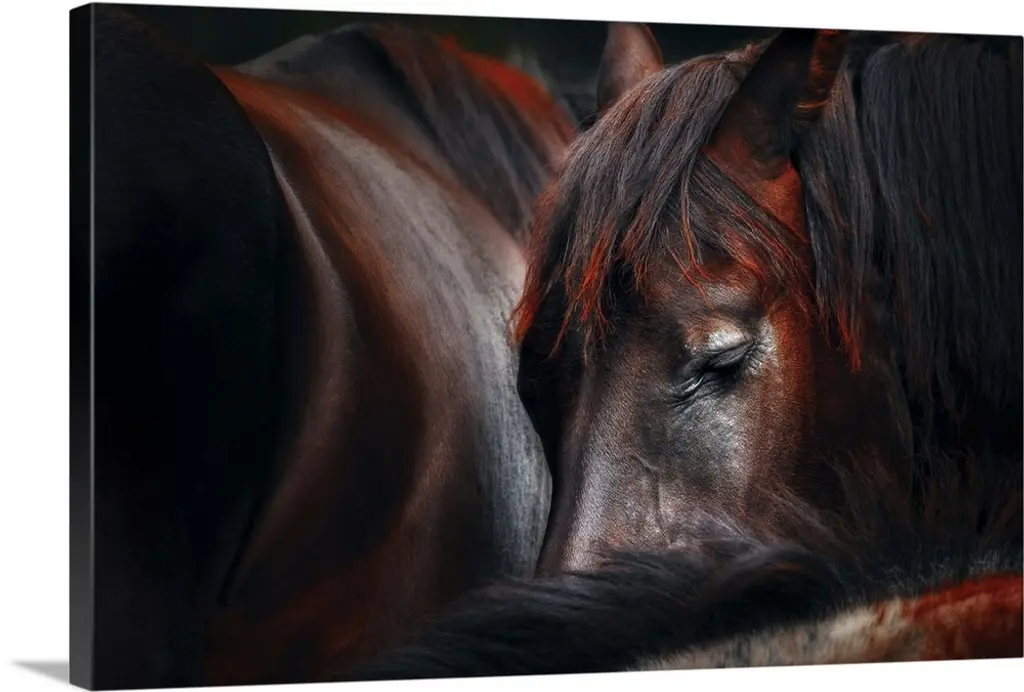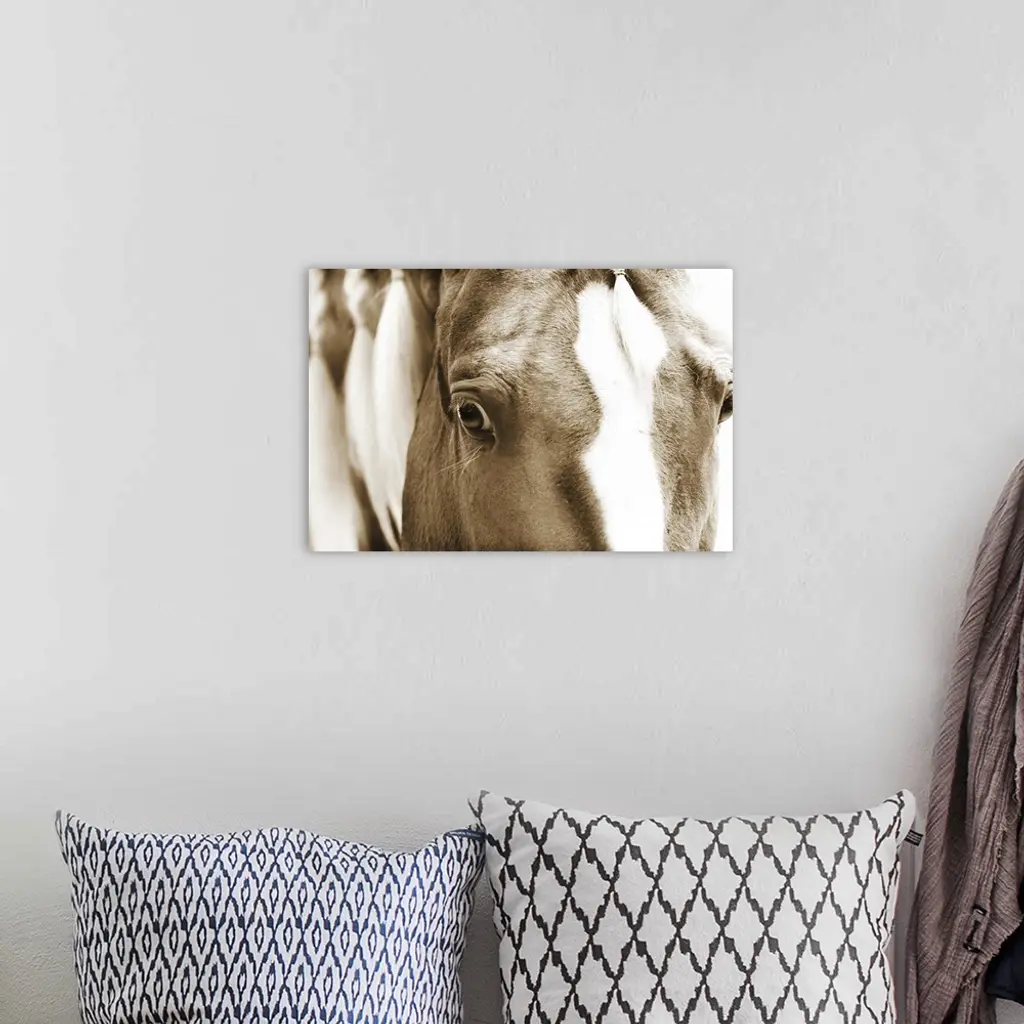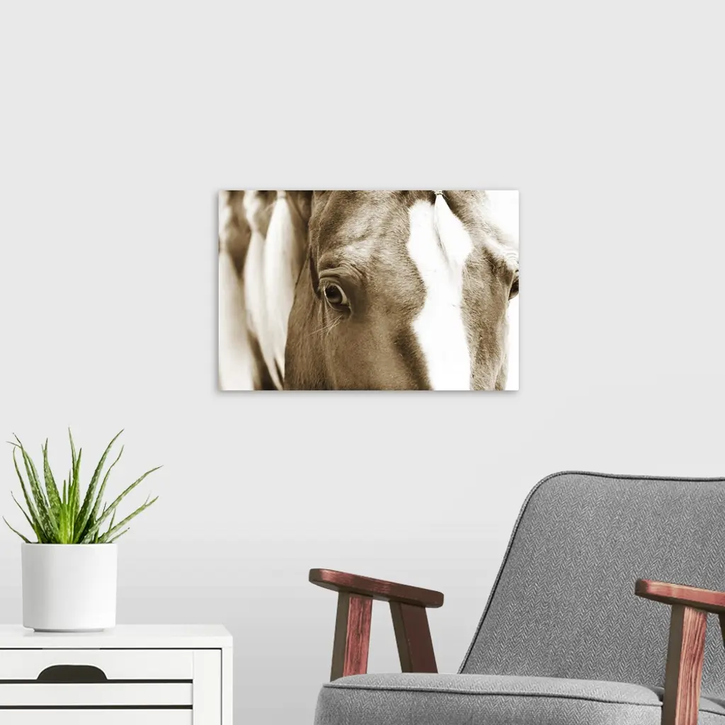 Sepia toned close-up photograph of a horse gazing into the camera. With a braided mane.
