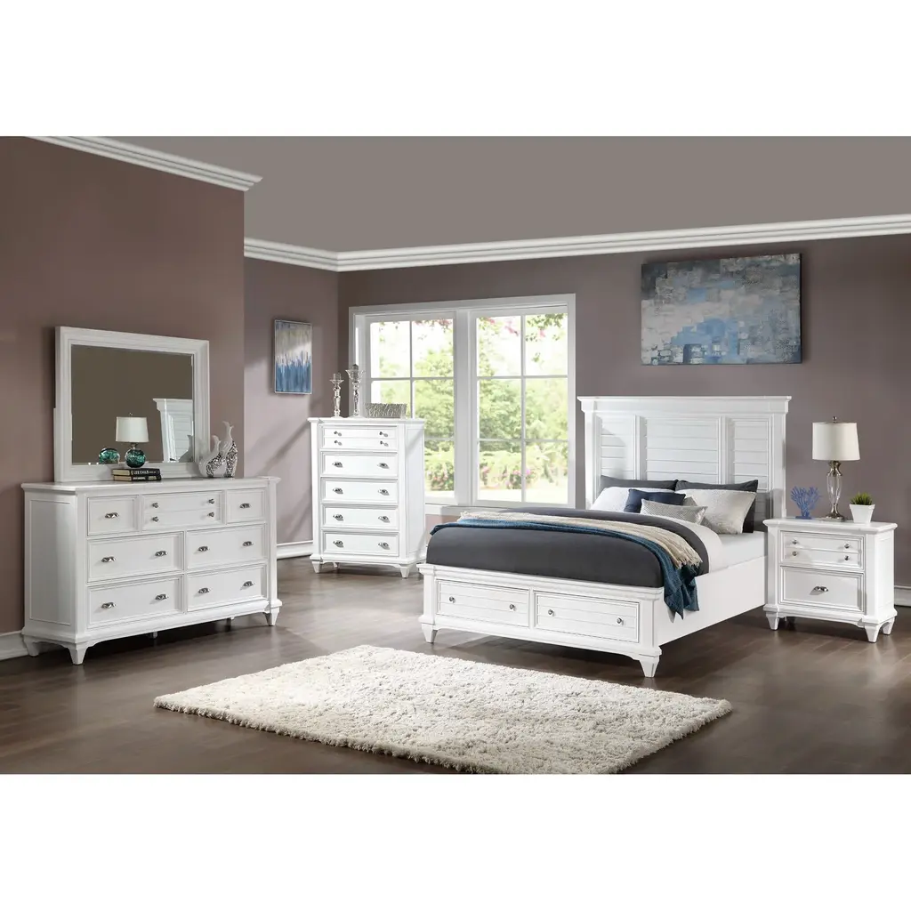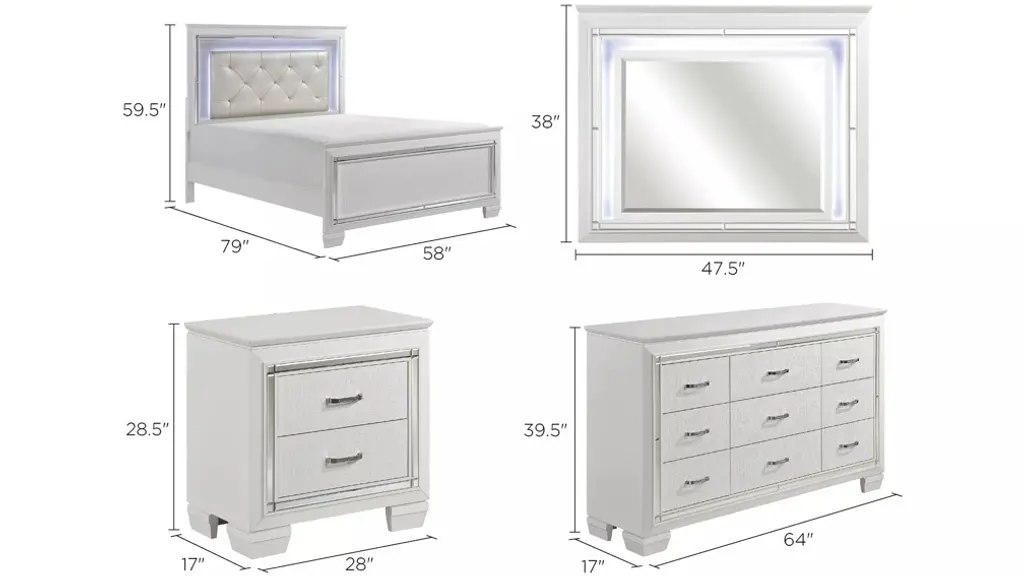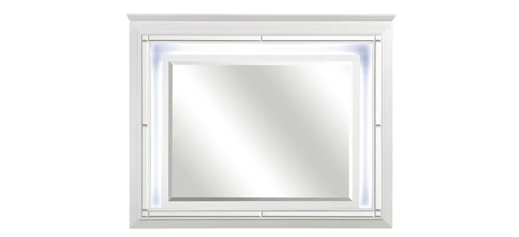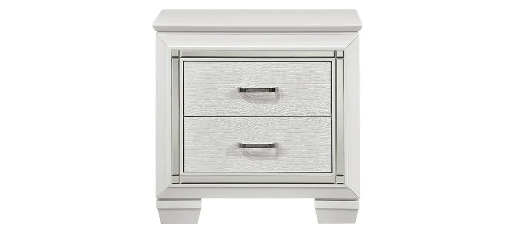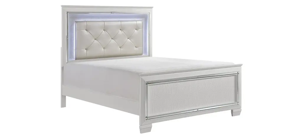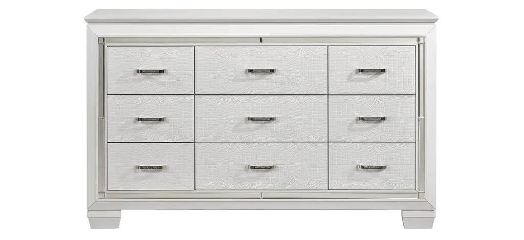 Glamour reigns in the design of the Brambley Bedroom Set. Framing the bed is a decorative beveled mirror accent that enhances the illumination from the touch-engaged LED backlight of the headboard. Alligator embossing and high polished crystal-enhanced hardware boldly accent the white finish as does the pearl-white faux leather crystal-tufted headboard insert.