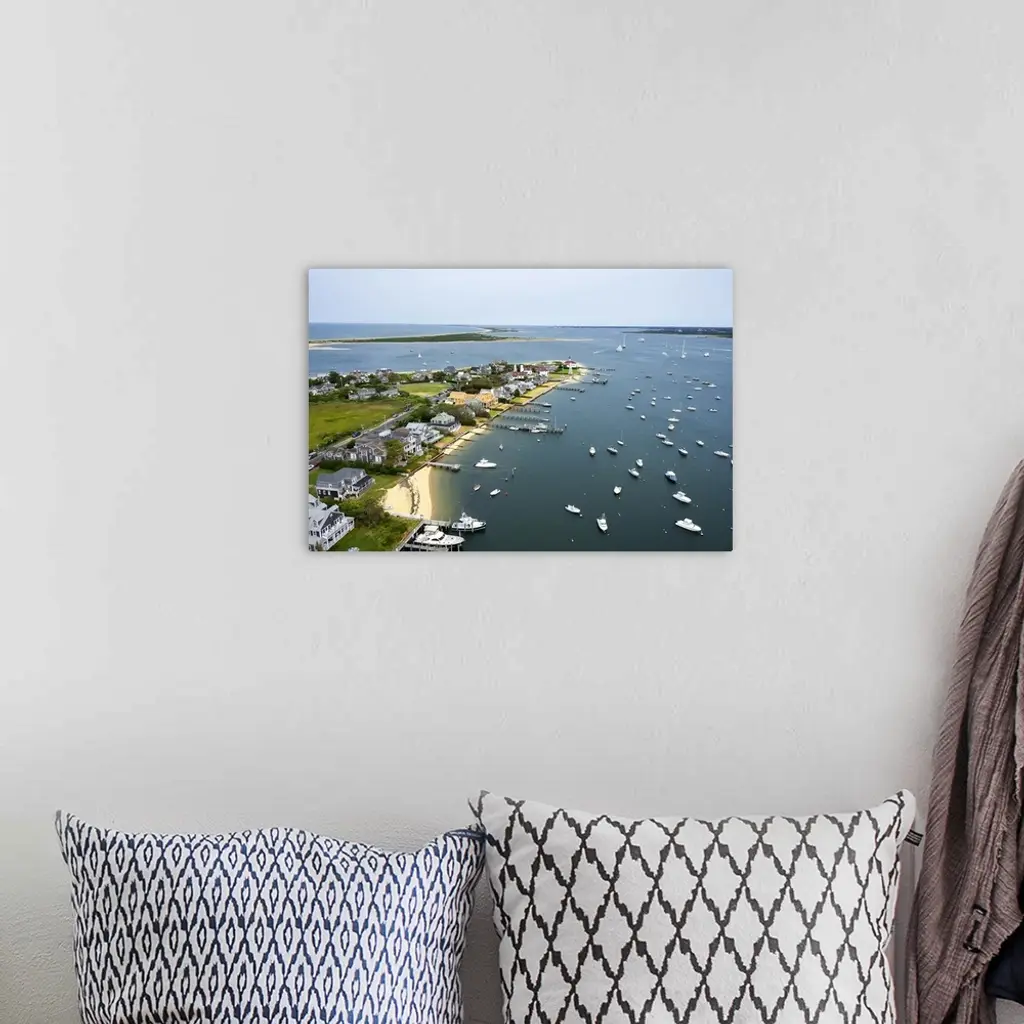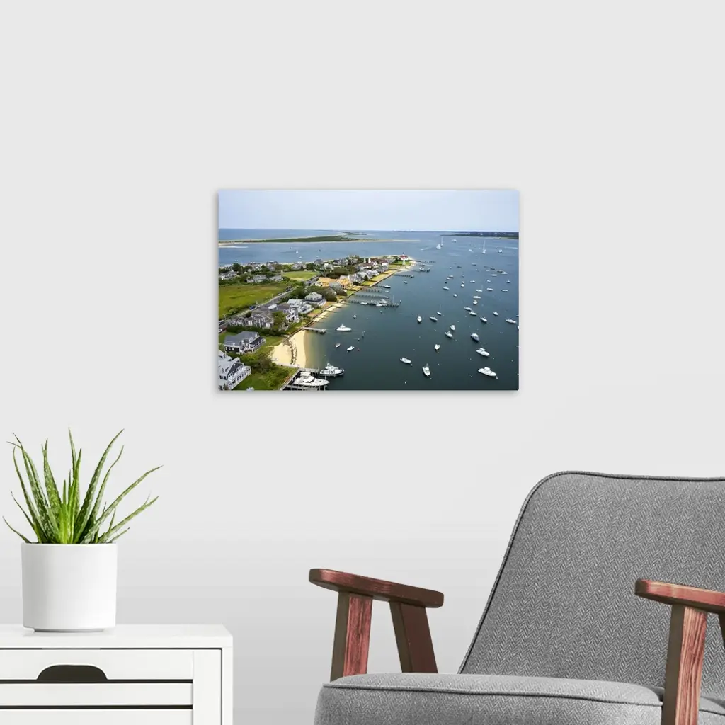Kite aerial of Brant Point and harbor and Coatue, Nantucket, MA.