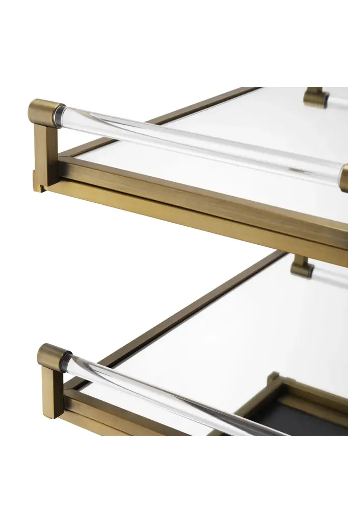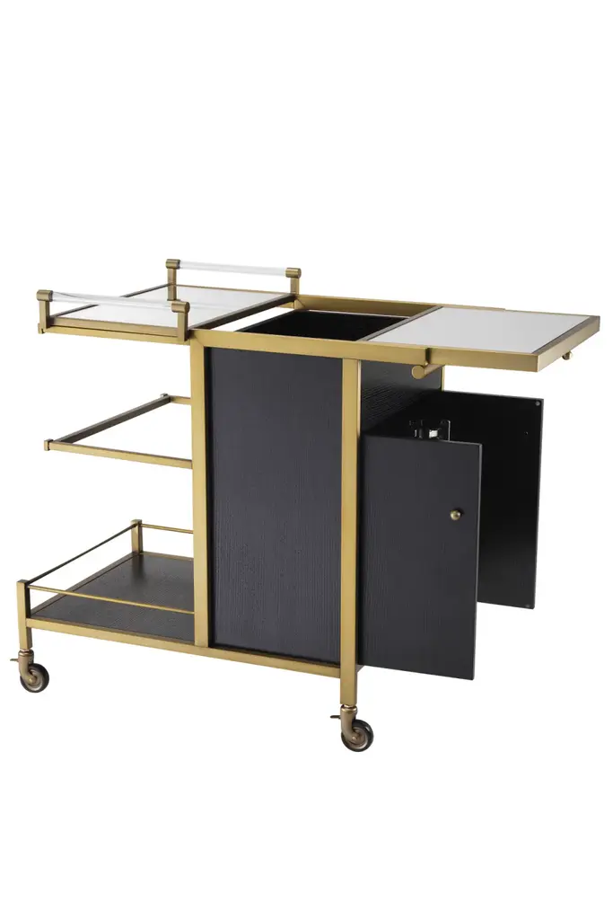 Make a splash with the brushed brass finish Eiffel Trolley. Your beautiful glassware and fancy gin bottles deserve to be shown off upon this must-have bar cart. With two detachable mirror glass serving trays and a black veneered cupboard, it offers ample space for display and storage. The cupboard has one shelf and is accessible from the frontside with doors. The top can be opened for access to a separate compartment for bottles.