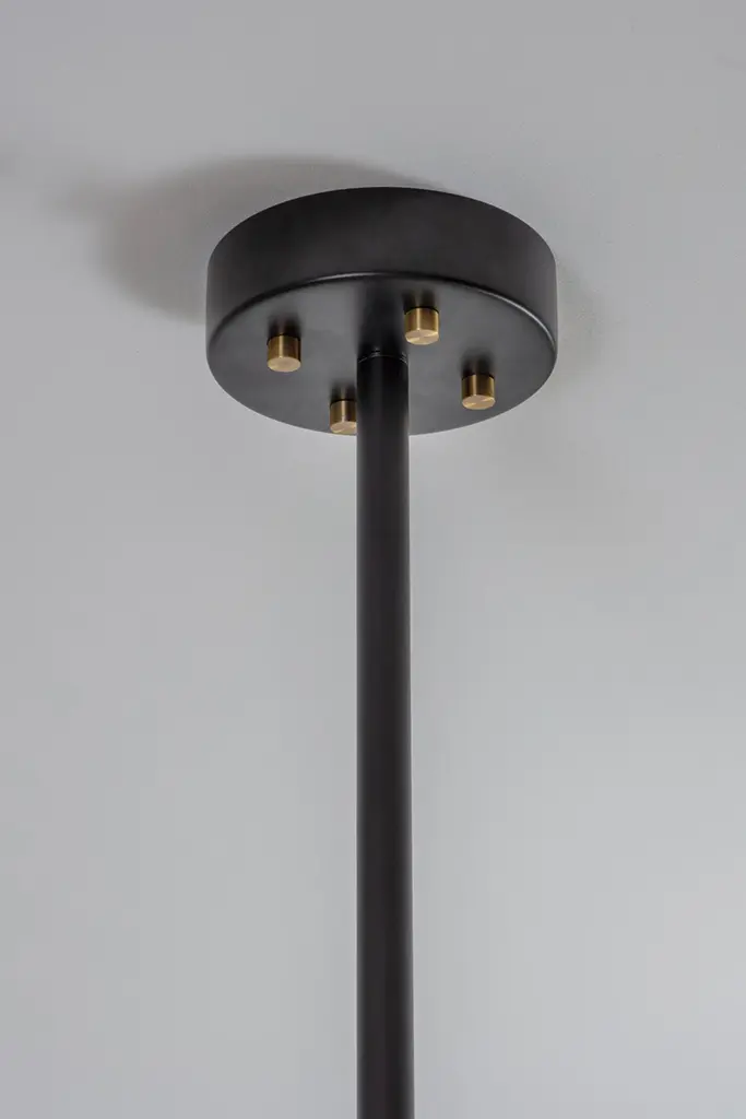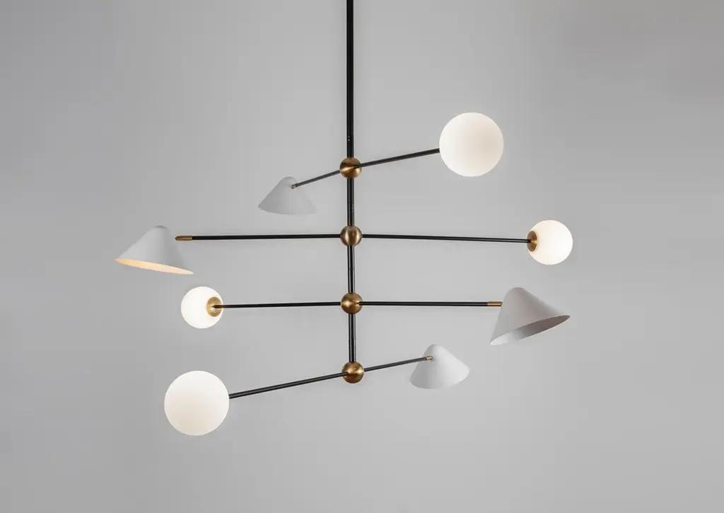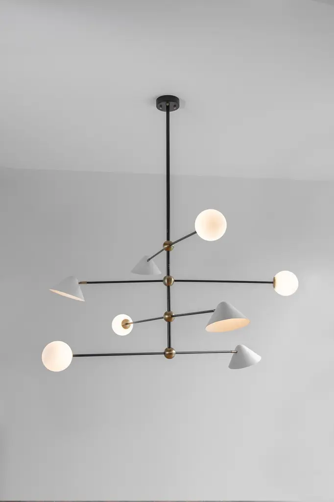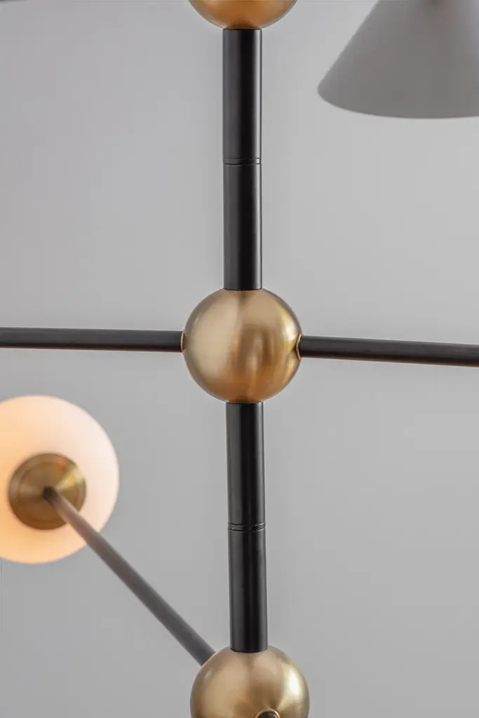 Brass Ball and Shade Pendant Light by Square in CircleDimensions: W 160 x H 147 x D 160 cmMaterials: Black painted metal, white painted metal shade, antique brushed brass, white frosted glassThis modern pendant light can be customized to different size and finishes. It is shown in a powder-coated black metal finish with brass ball joints at the centre. Each pole has a metal shade at one end and an frosted glass globe at the other.Square In Circle is a London-based design studio founded in 2019. The studio explores lighting design in minimal, geometric forms inspired by the Modernist Era. Materials such as marble, metal and glass combine to make each sculptural piece a 'total and complete work of art', as in the manner of Gesamtkunstwerk.All our lamps can be wired according to each country. If sold to the USA it will be wired for the USA for instance.