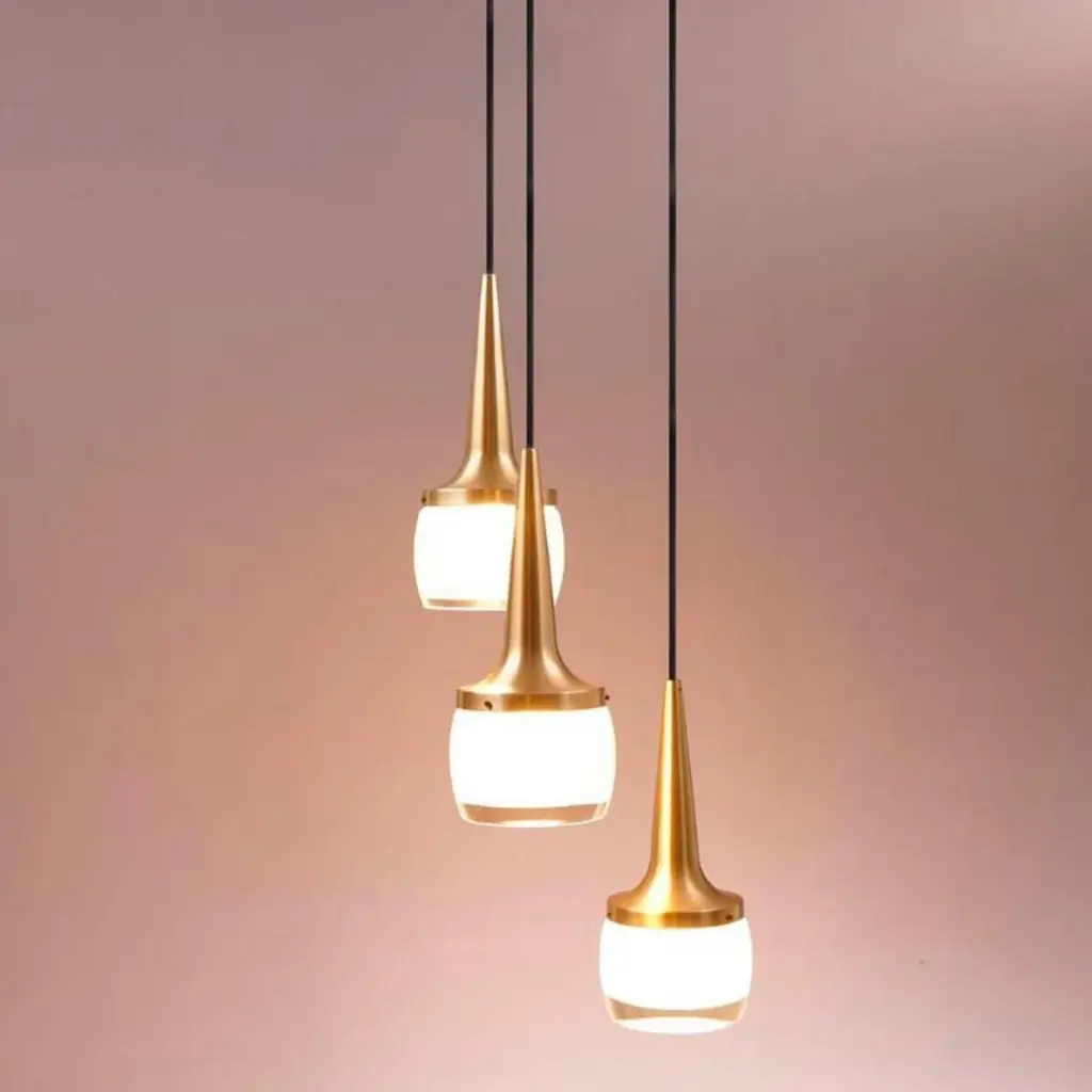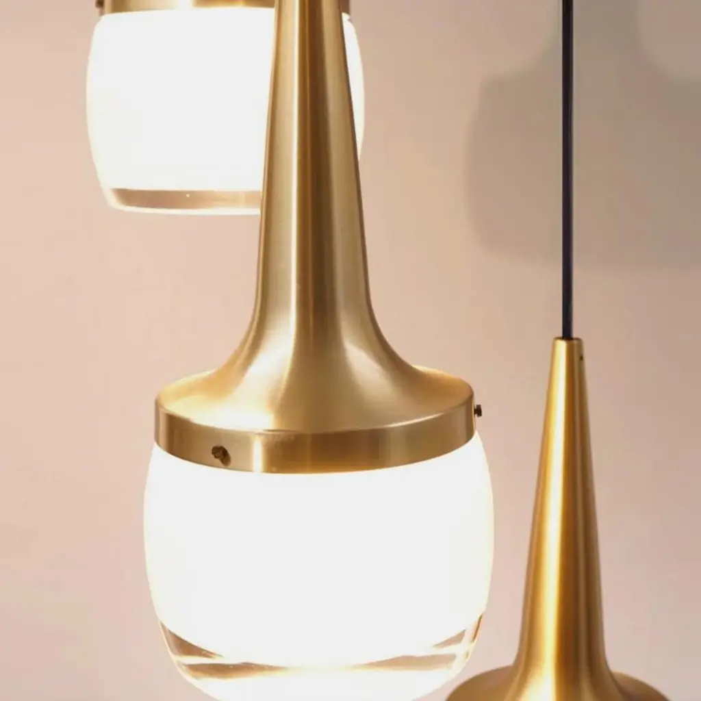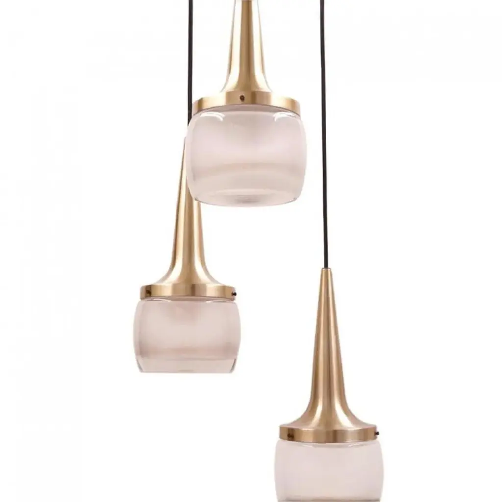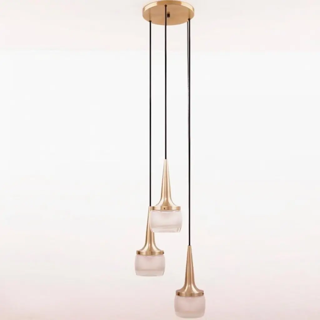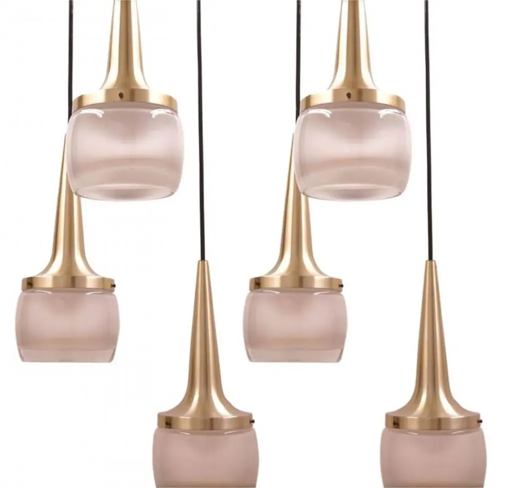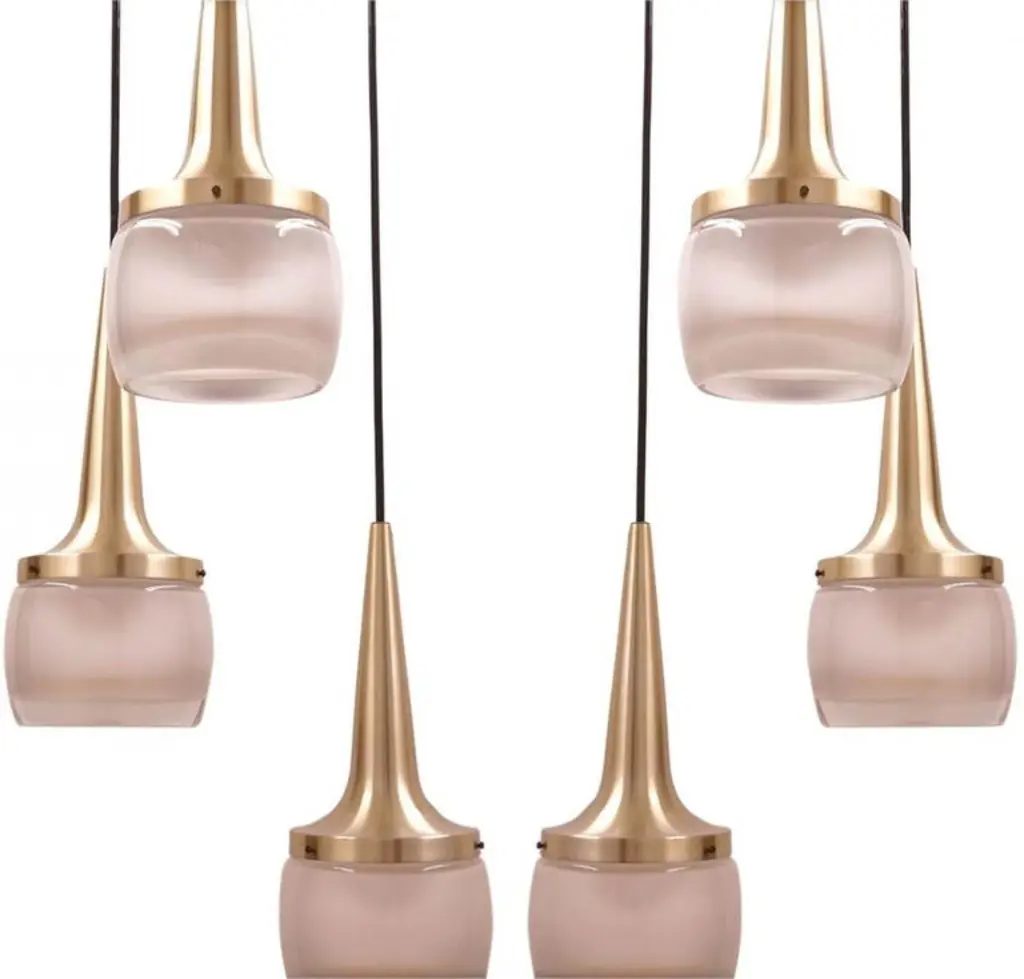 This elegant cascade light was manufactured by staff leuchten in germany. The light is executed in brassed aluminium and thick opaline molded glass etched on the inside. Each individual pendant measures: 13.5 in. H x 5.25 in. D. Dimensions fixture height: 42 in. (106 cm), diameter: 12 in. (30 cm) drop rod can be adjusted as required, free of charge, for greater or lesser drop. Two cascades fixtures available. In very good original condition. Each pendant fits one e27 bulb up to 40 watts each and is led compatible. All electrical items function on various voltage standards (from 110 till 240 volts / ex. Usa-uk- etc.) this piece is attributed to the mentioned designer/maker. It has no attribution mark and no official proof of authenticity, however it is well documented in design history. I take full responsibility for any authenticity issues arising from misattribution, up to 250v (europe/uk standard).the wiring of this item may be original and might need replacement, if not specified otherwise.