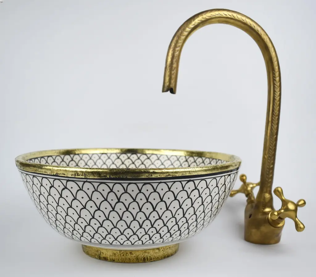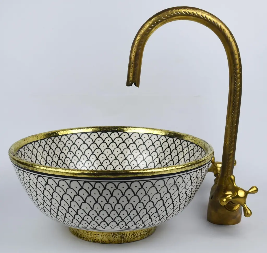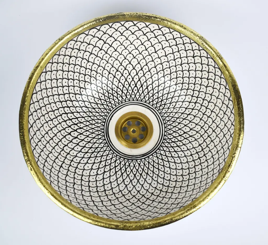Elevate the Beauty of your bathroom with our Brass Rim Sink. This ceramic vessel sink is skillfully handcrafted by our artisans creating a captivating piece of art. We coverted The edges with solid Brass is meticulously added, with each stroke applied with precision and care by our team of craftsmen. Our Moroccan Paint sink truly embodies the artistry and dedication of our craftsmen. It showcases their commitment to delivering quality and exquisite design. The hand painted details add an unique touch to your space making it a stylish focal point for any bathroom. Crafted from high quality brass and ceramic this sink not exudes aesthetic charm but also ensures long lasting durability. It will retain its beauty for years to come becoming a timeless addition, to your home. The vibrant colors palette complements styles infusing your bathroom decor with a touch of exotic allure. This sink bowl, beautifully painted by hand includes a high quality brass drain at no cost. Not does it add a touch of style to your bathroom decor. It also offers practicality and functionality. You can be confident that this sink is not just visually appealing but a valuable addition, to your space. Embrace the artistry and craftsmanship of Moroccan design with this exceptional handpainted sink, transforming your bathroom into a sanctuary of style and sophistication. Please note that due to the handcrafted nature of this sink, there may be slight variations in color and pattern, making each piece truly unique.