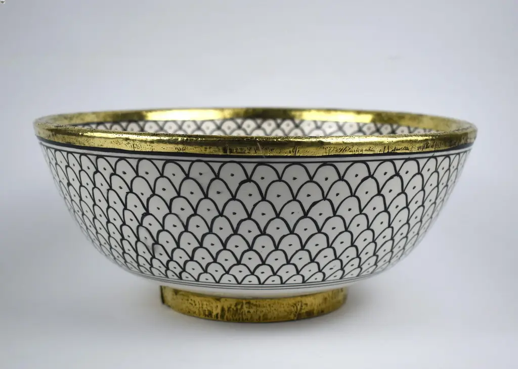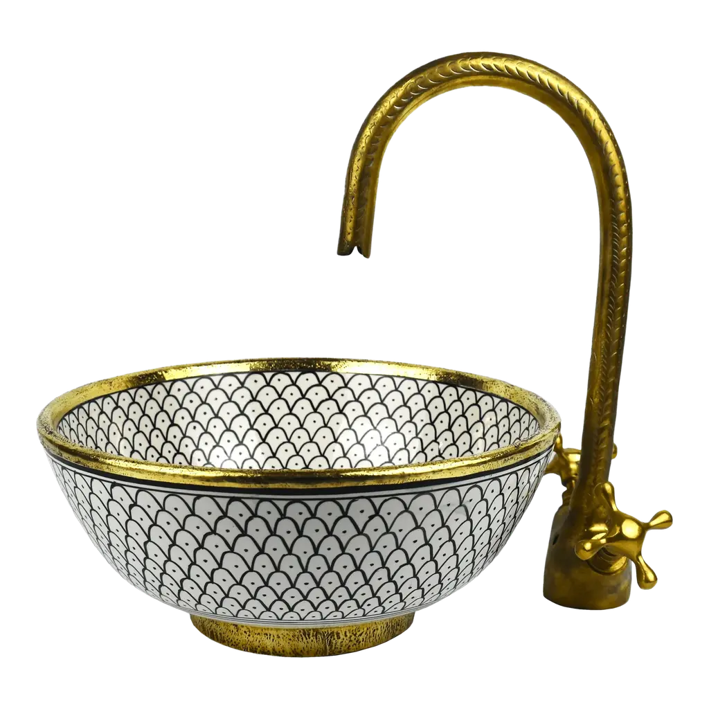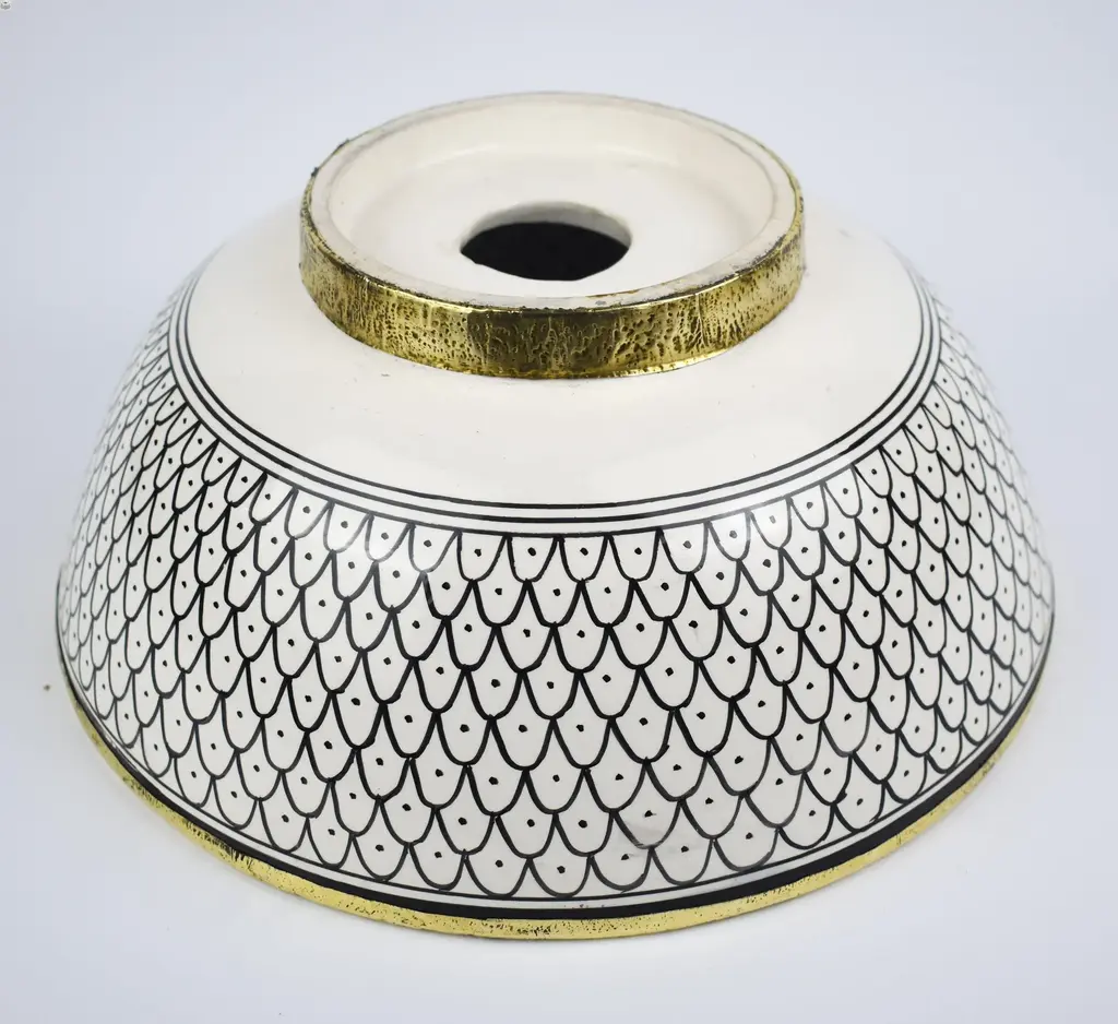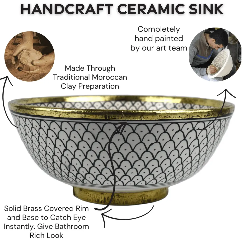 Elevate the Beauty of your bathroom with our Brass Rim Sink. This ceramic vessel sink is skillfully handcrafted by our artisans creating a captivating piece of art. We coverted The edges with solid Brass is meticulously added, with each stroke applied with precision and care by our team of craftsmen. Our Moroccan Paint sink truly embodies the artistry and dedication of our craftsmen. It showcases their commitment to delivering quality and exquisite design. The hand painted details add an unique touch to your space making it a stylish focal point for any bathroom. Crafted from high quality brass and ceramic this sink not exudes aesthetic charm but also ensures long lasting durability. It will retain its beauty for years to come becoming a timeless addition, to your home. The vibrant colors palette complements styles infusing your bathroom decor with a touch of exotic allure. This sink bowl, beautifully painted by hand includes a high quality brass drain at no cost. Not does it add a touch of style to your bathroom decor. It also offers practicality and functionality. You can be confident that this sink is not just visually appealing but a valuable addition, to your space. Embrace the artistry and craftsmanship of Moroccan design with this exceptional handpainted sink, transforming your bathroom into a sanctuary of style and sophistication. Please note that due to the handcrafted nature of this sink, there may be slight variations in color and pattern, making each piece truly unique.