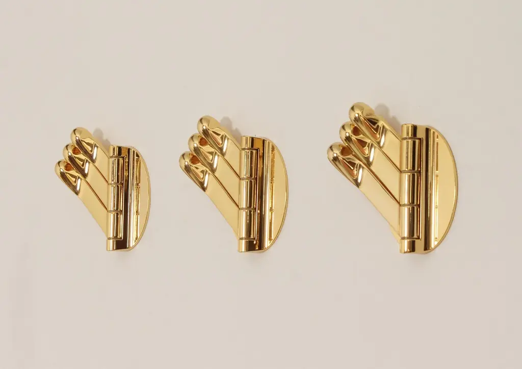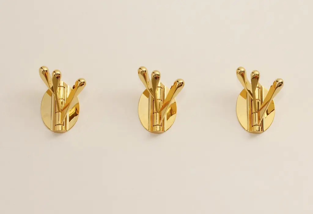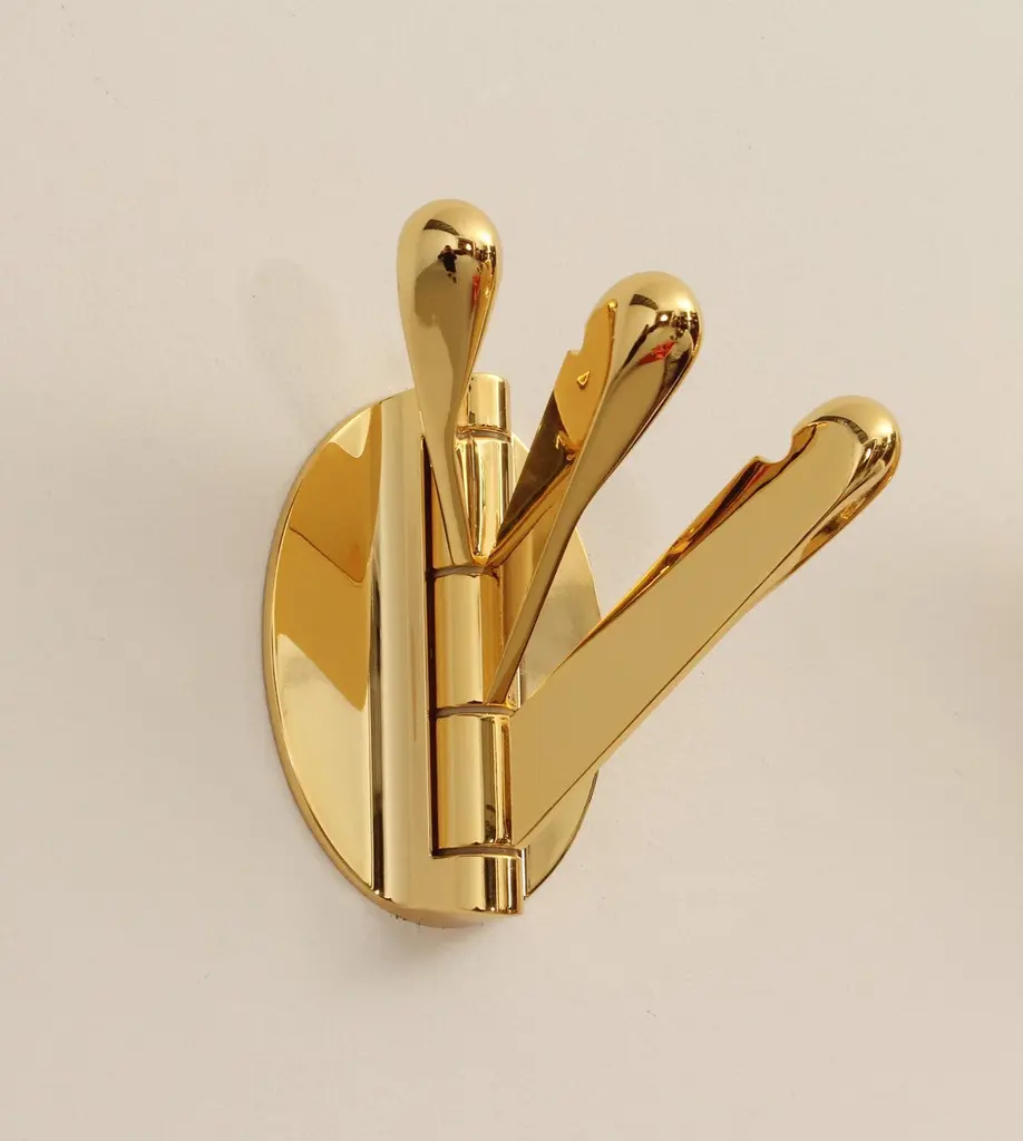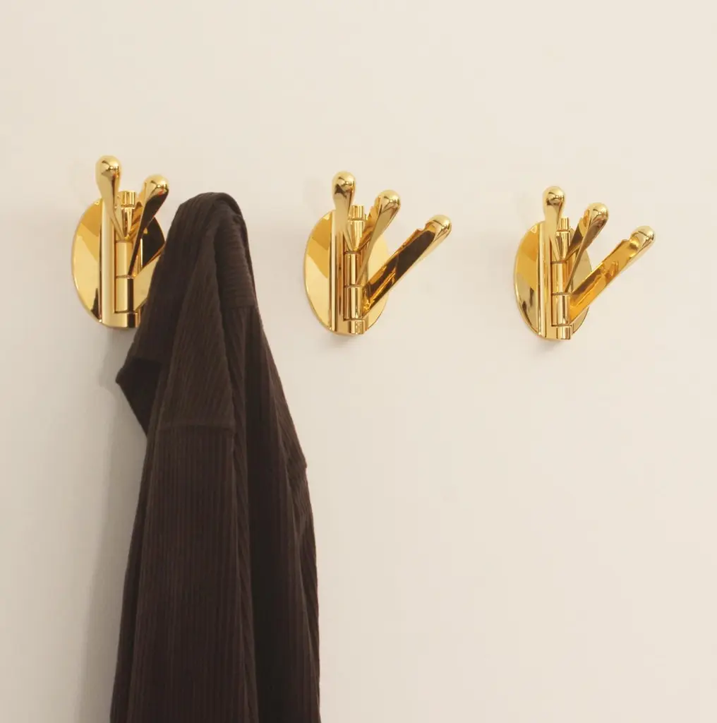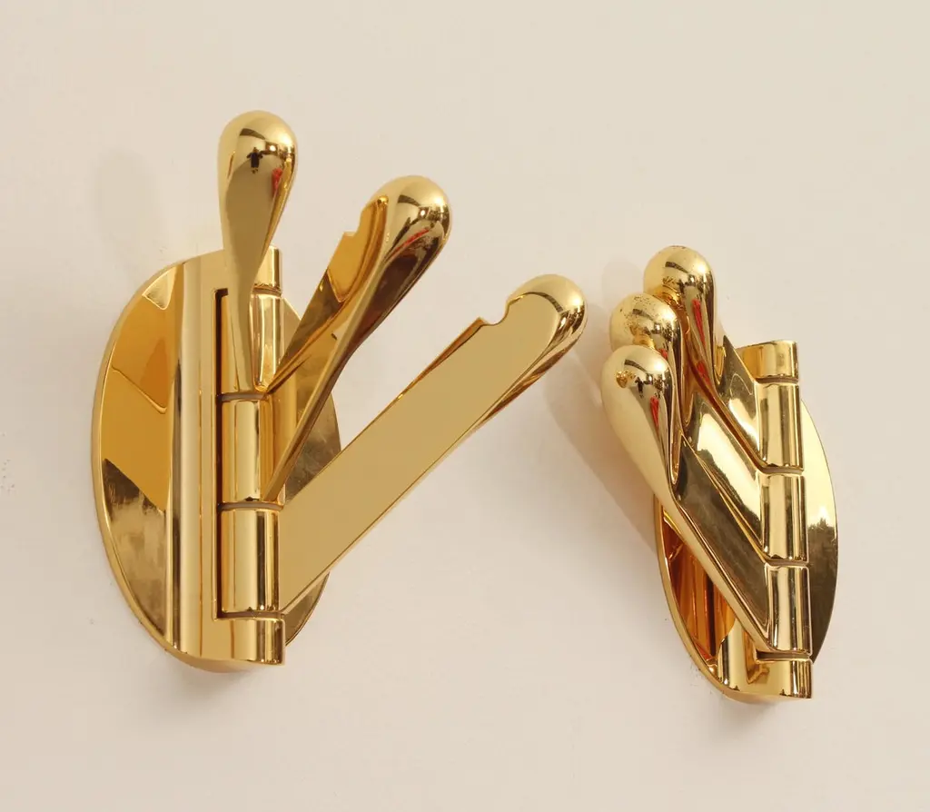 Brass triple folding wall coat racks, Spain, 1970's. Composed of three movable hangers each that can be moved according to use.