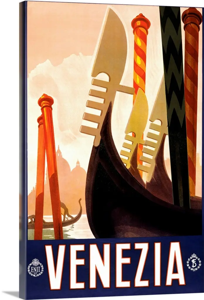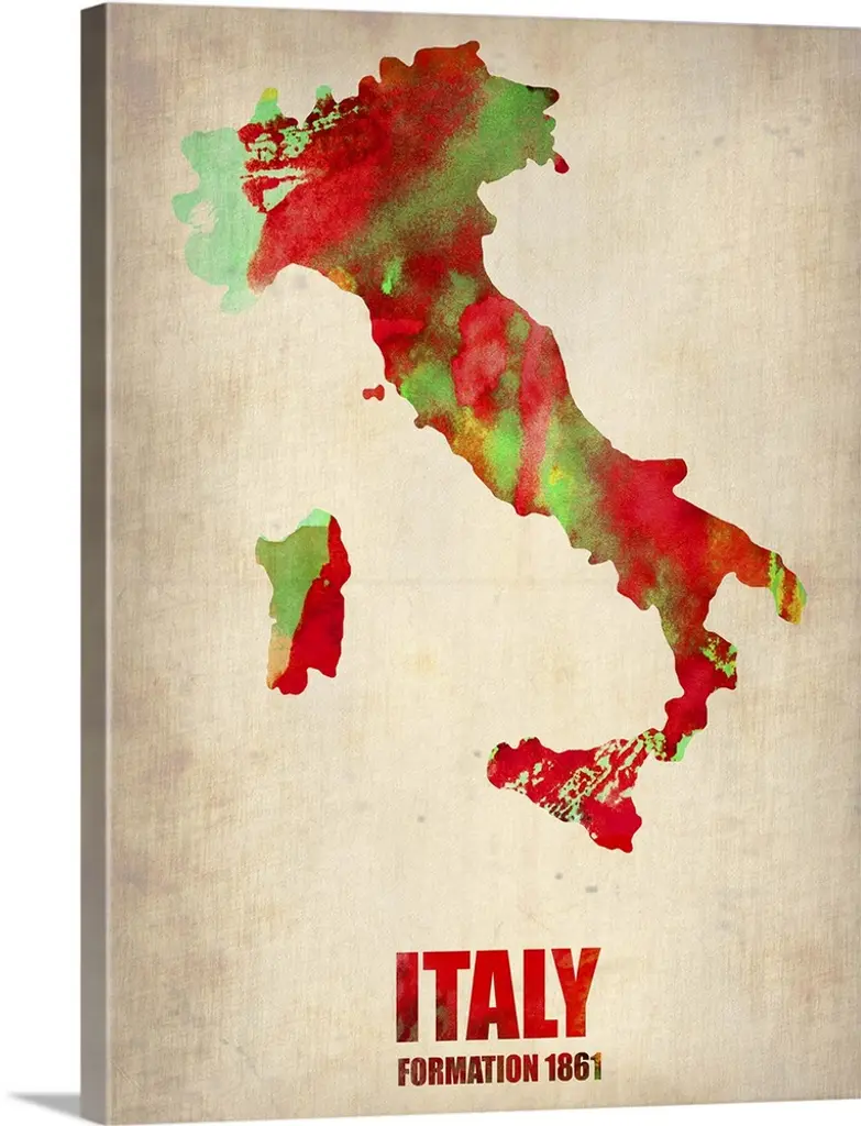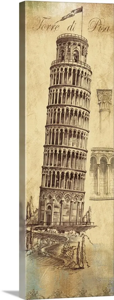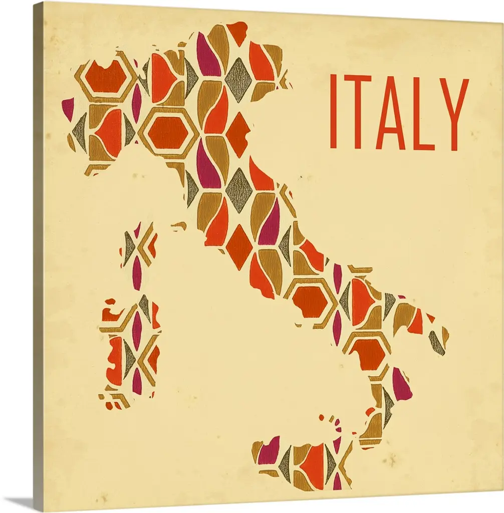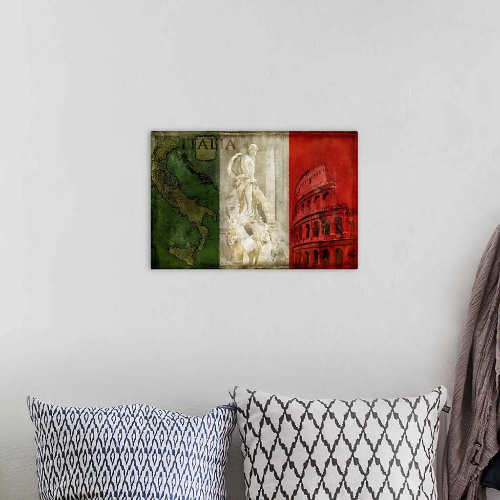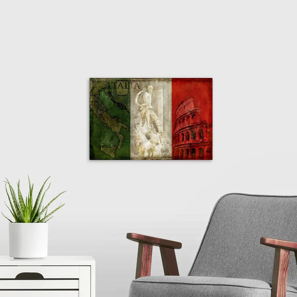 Weathered flag of Italy with illustrations of famous landmarks on top.