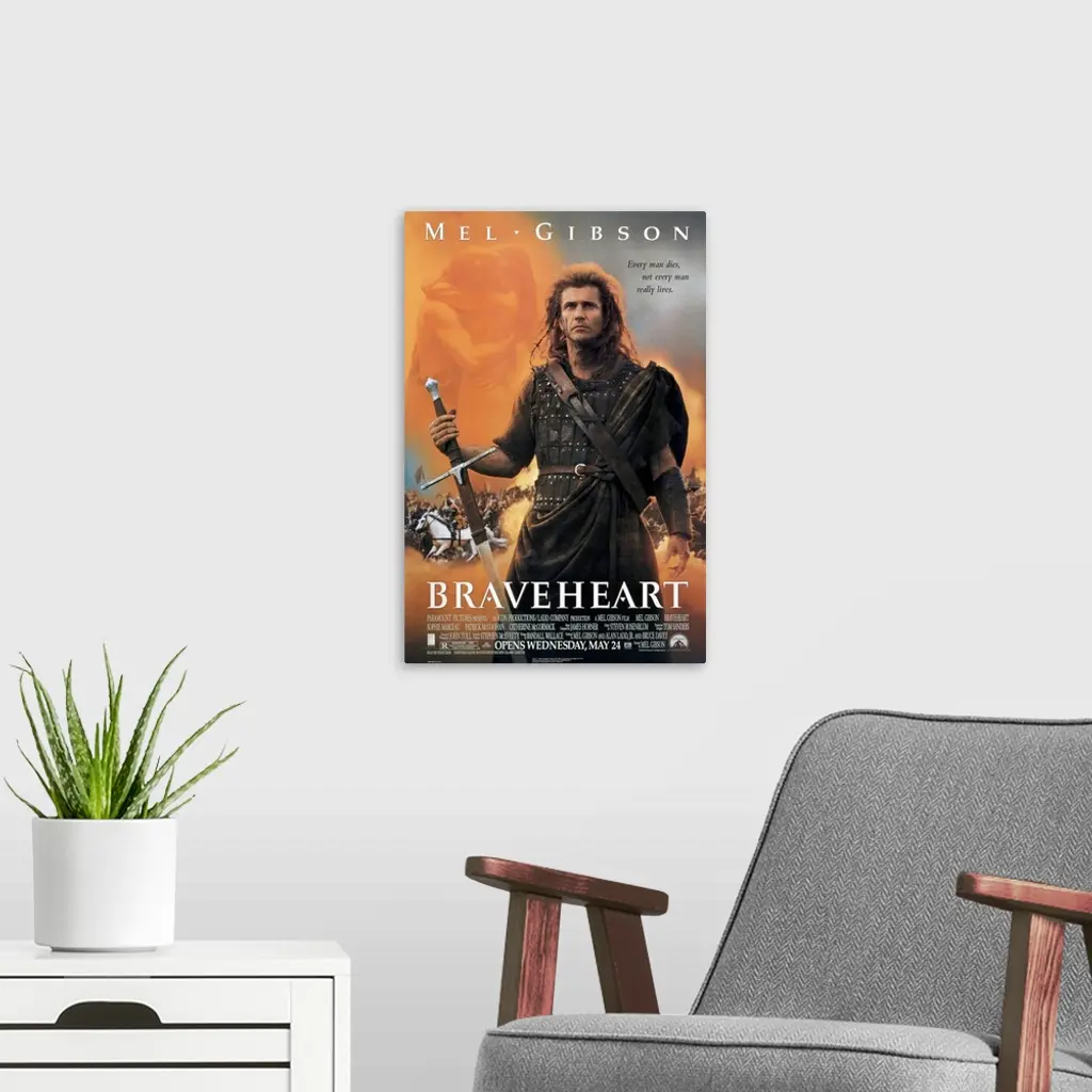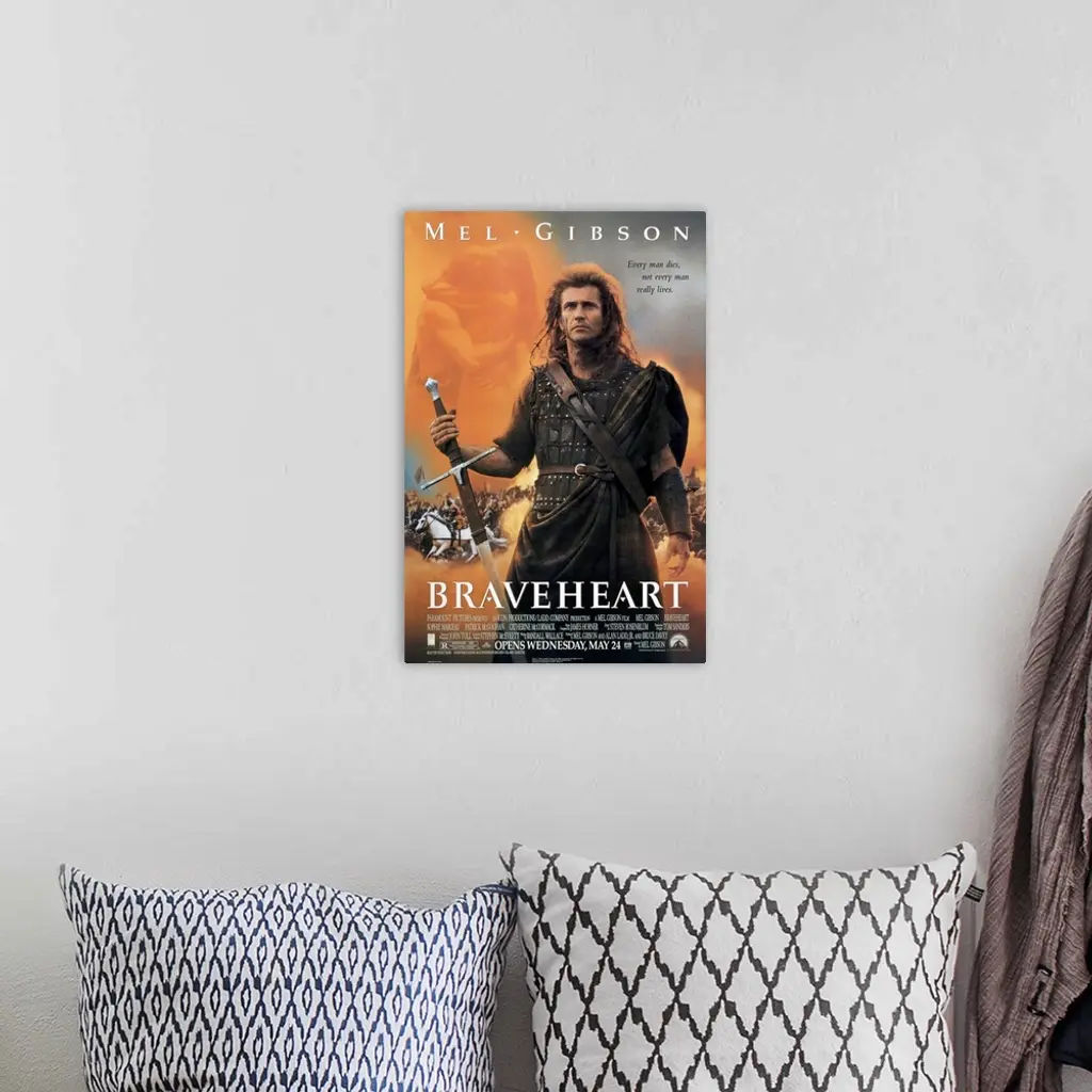 Big, vertical movie advertisement on a wall hanging for Braveheart, Mel Gibson stands as a warrior in front of a battle scene, a couple embracing in the top portion of the image. Text of movie description and credits at the top and bottom of the image.