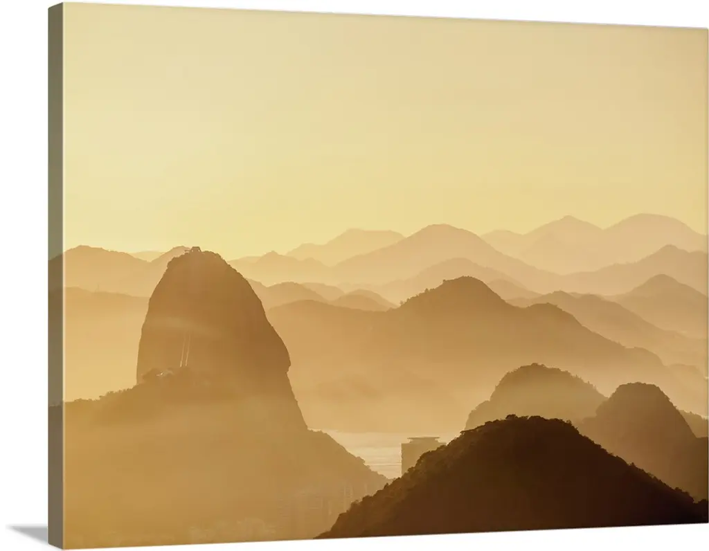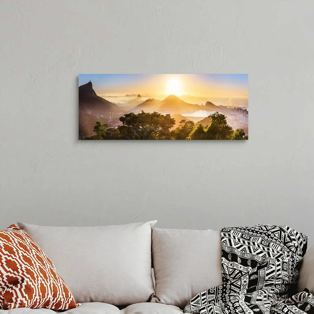 Brazil, Rio de Janeiro, Corcovado, Christ the Redeemer, City at sunrise, Corcovado, Cristo Redentor, Sugarloaf Mountain, Lagoa Rodrigo de Freitas and Ipanema Beach, view from Foresta da Tijuca.