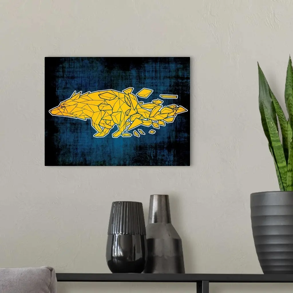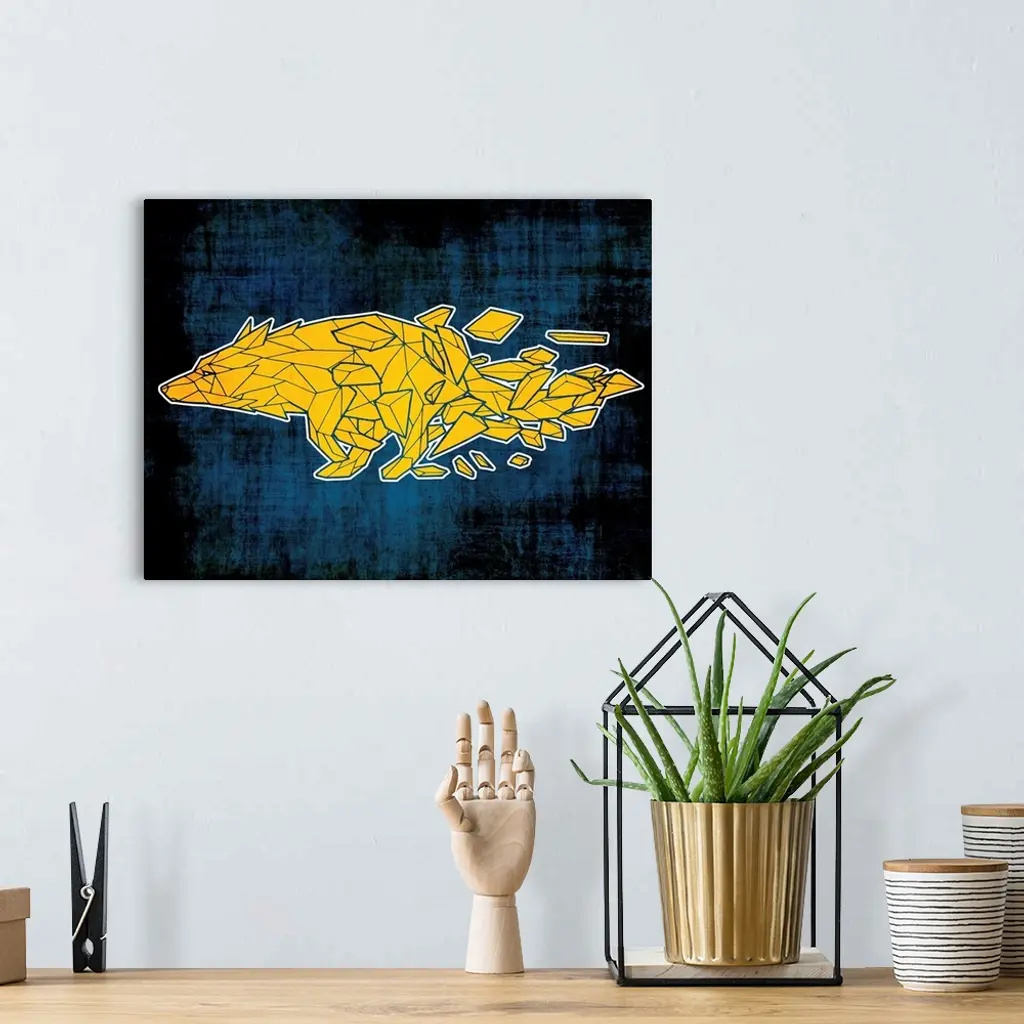 Illustration of a yellow wolf made out of geometric shapes on a dark blue and black background.