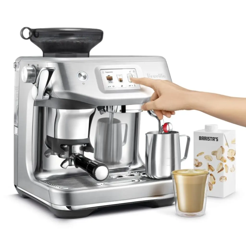 Beautifully sleek in stainless steel, the Barista Touch Impress streamlines and simplifies espresso drinks for the home barista. The conical burr grinder offers 30 settings, and assisted tamping guarantees a precise, polished puck of grounds every time for even brewing and less mess. The first home espresso machine with automatic settings for non-dairy milk, the impress froths lush microfoamautomatically adjusted to your desired temperature, texture and type of milkwith the hands-free steam wand. Touchscreen controls offer step-by-step guidance through the grinding, brewing and steaming process to create exquisite espressos, cappuccinos, lattes and more.Need help choosing? View our Breville espresso makers comparison chart.