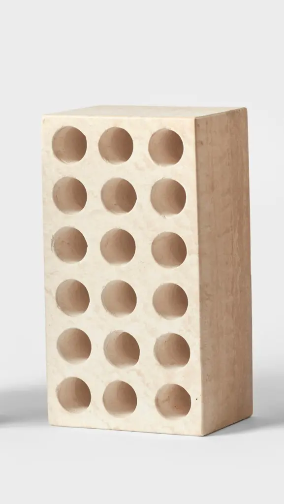 Brick by RF StudioDimensions: W 12.5 D 9 x H 23 cm Materials: Andes StonesAlso Available: Other finishes available.The brick is a generic constructive element that constitutes part of the urban imaginary. In Peru, moreover, its image is linked to the phenomenon of migration from the countryside to the capital that began in the 1940s and involved new constructions of collective space on the outskirts of Lima, new urban centres in the different regions of the country and new forms of self-construction of housing. Based on the concept of constructive material, Bricks suggests the question of whether there is continuity between the materiality of the natural territory and the materiality of the contemporary urban habitat; and whether it is possible to recover the relationship with the diversity and particularity of each of the ecosystems we inhabit. The pieces pose the fragile balance between the processes of material transformation within nature and the systems of production, extraction and construction of our society.ESTUDIO RF is located in Lima, Peru. We are dedicated to the research of the contemporary habitat and natural environments in the Peruvian context, seeking to dissolve established limits between them. Our multidisciplinary team is conformed by visual artists, architects, traditional artisans, performers, designers, actors and writers. We regard art as an open field that functions like a hub that establishes new relationships between nature and human activity.We aim to rebuild the continuity between natural landscape, art and architecture by reconnecting the current urban condition with the bodily experience of being free in the wilderness. We acknowledge fluidity and non-definition of the landscape; a wild and dynamic setting were everything coexists without visible hierarchy or law.In opposition, the urban landscape is defined by social codification, segregation and segmentation of space. The values of the global market and technological modernity are creating distance and alienation in everyday life.Faced with this, we return to the heterogeneous, through natural ecosystems, to raw materials, to organic processes and to traditional local craft; we bring to light its real value, and reestablish contact between these elements and the body.We consider the human being and society not as nucleus, but as part of an ecosystem; a big community of living organisms. In a society governed by images, noise, artificial light and industrial materials, we find solace and intimacy in the darkness of the wild environment that meet us through the opaque and warm qualities of the natural shadows surrounding us.We create a balance between visible and palpable, between sound and silence, between industrial or digital production and natural or artisanal materials. Our goal, beyond ideologies or artistic intent and manifestos, is to reimagine the intimate acts of daily life as a potential means for future transformation.