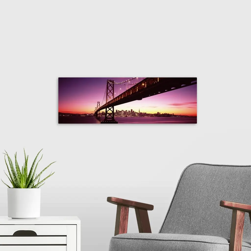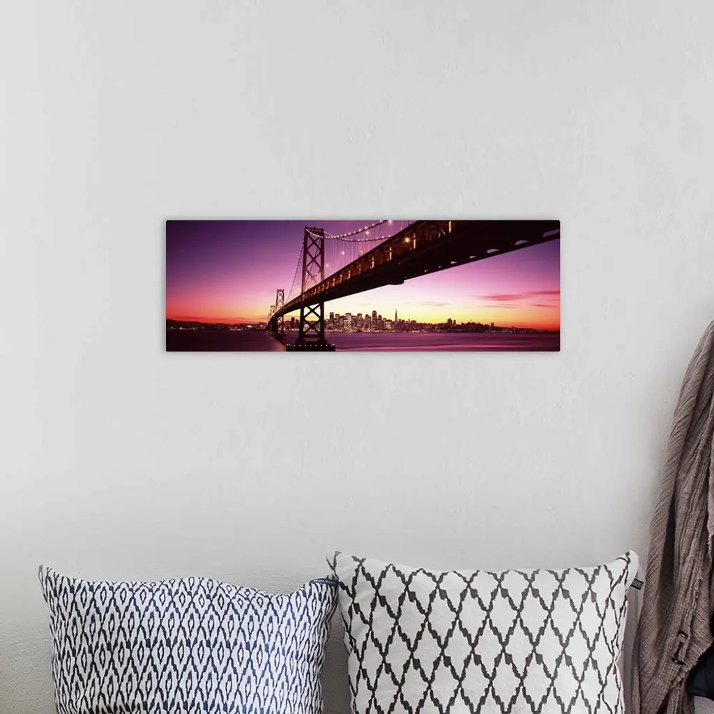 Large panoramic photo print of a long bridge leading to a lit up city off in the distance at sunset.