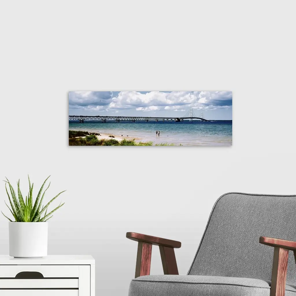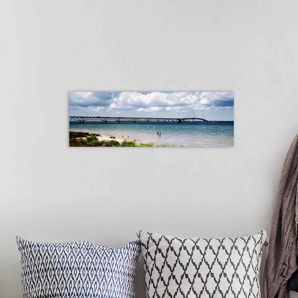 Panoramic picture of a massive bridge that stretches across a lake in Michigan. Some beach on the lake can be seen with two people standing ankle deep in the water.