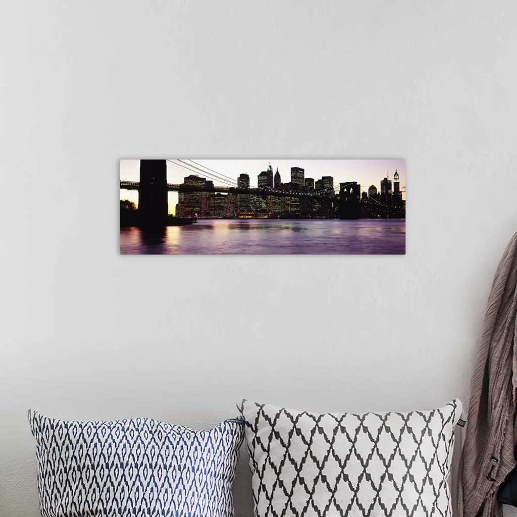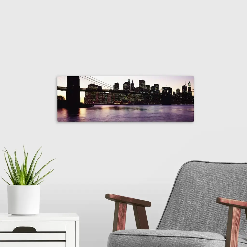 This decorative wall art is a panoramic photograph taken from ground level of the base of the suspension bridge and the city silhouetted against the sky at dusk and defined by their lights.