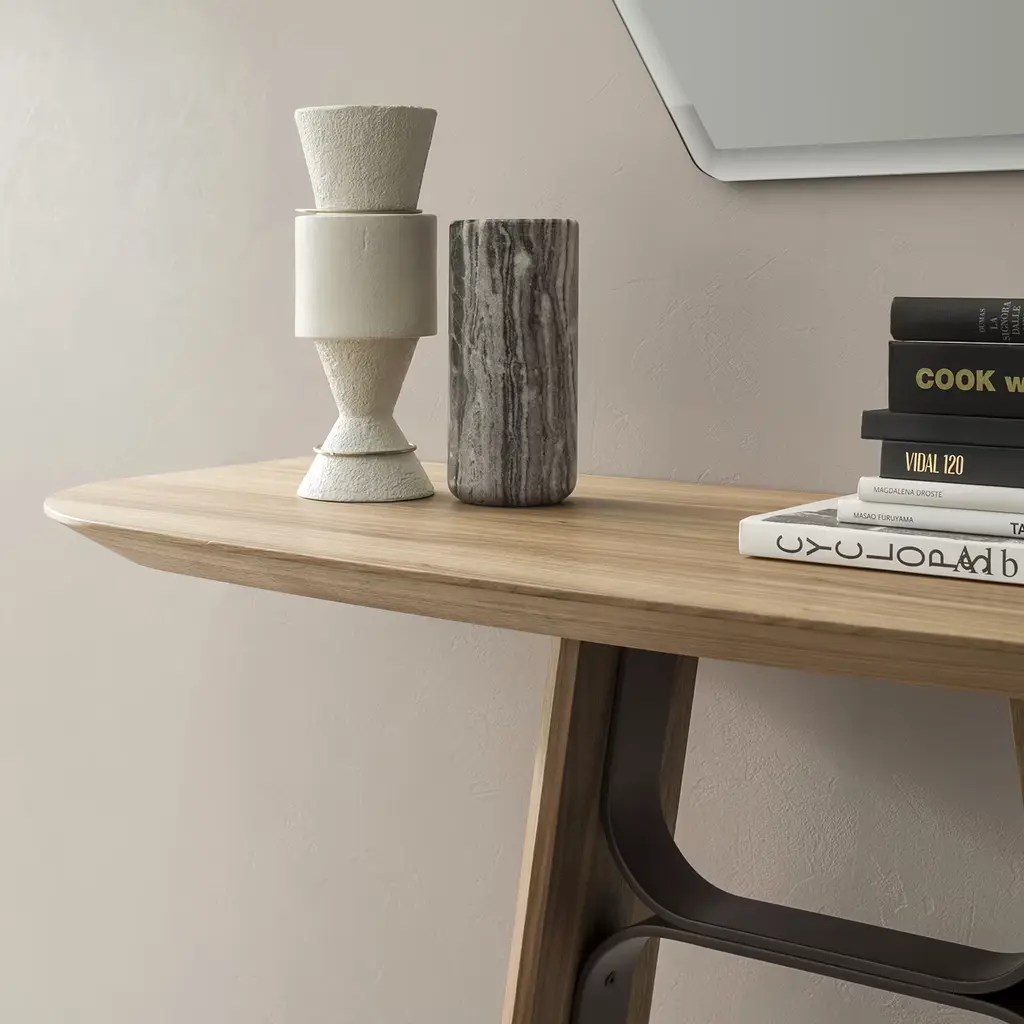 Dynamic and harmonious in its silhouette inspired by fluid-lined bridges, this console was designed and crafted with painstaking attention to detail borrowed from haute couture. Curved metal beams reinforce the slanted legs, which share with the shaped top the same lightweight MDF core and precious Canaletto walnut veneer. Hand-blunted, the top's border adds personality to the design. The console is designed to be installed on the wall.