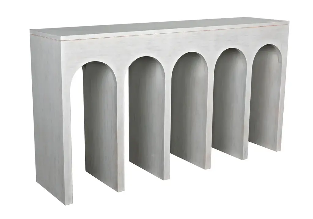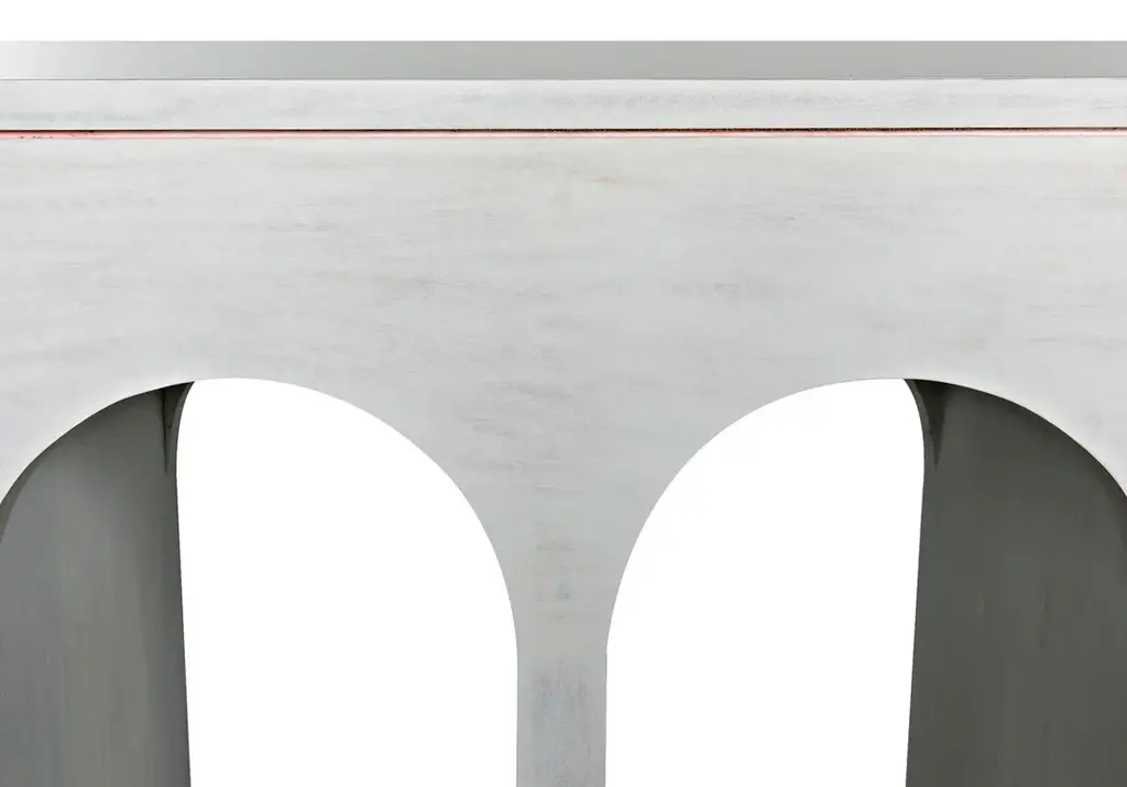 This console showcases repeating archways creating a curved, shapely silhouette. A slim cutout runs along the top for an added touch of dimension. Its versatile white wash finish accentuates its natural wood graining, lending texture and refinement. Style in a hallway, entryway, or in the living room for a tasteful, sculptural addition.