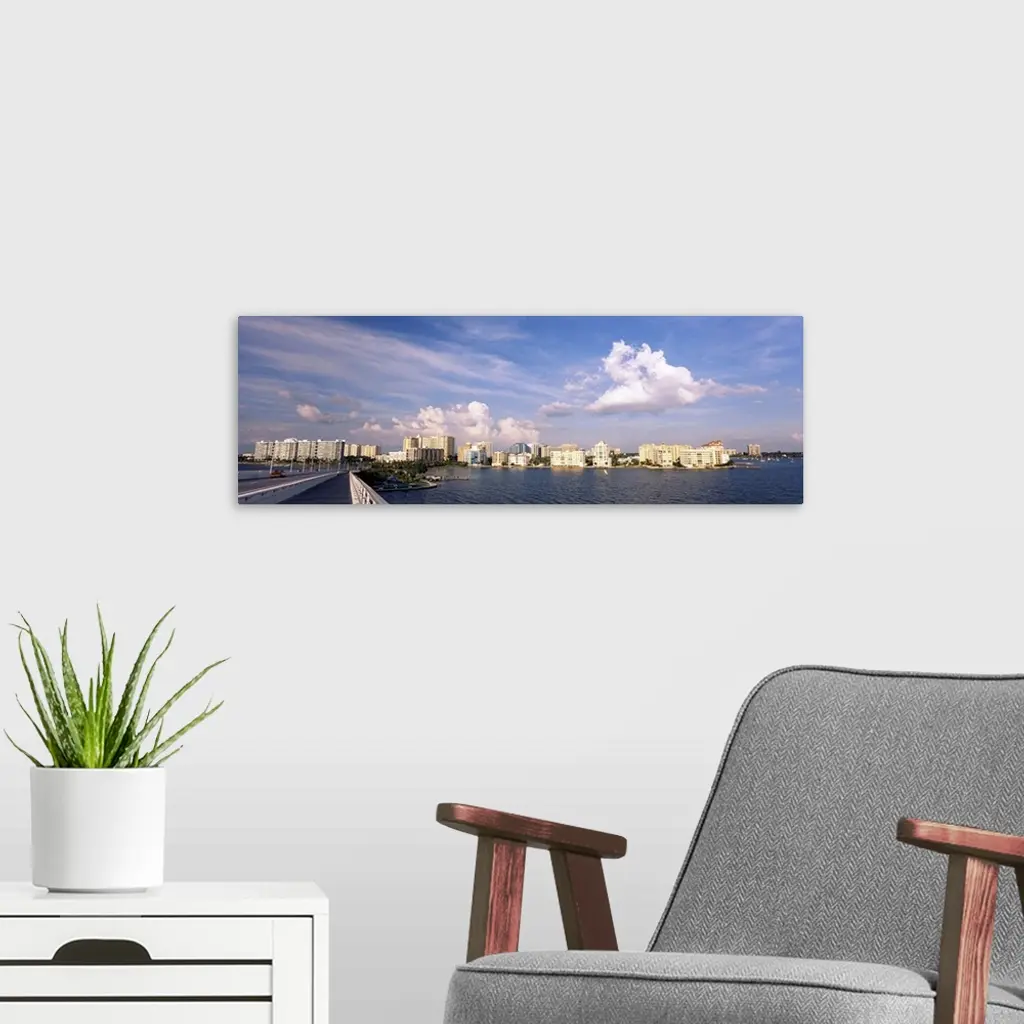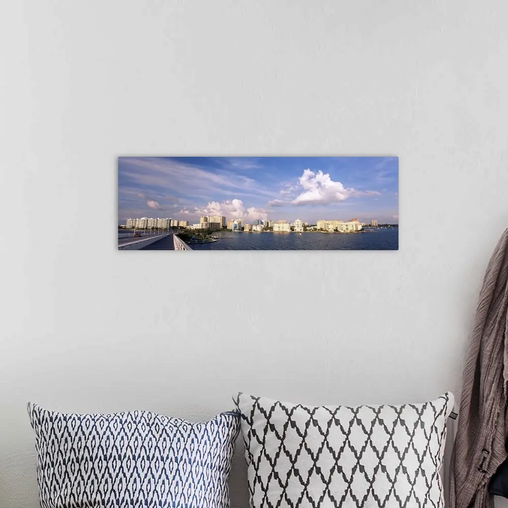 Bridge with city skyline at the waterfront, John Ringling Causeway Bridge, Sarasota Bay, Sarasota, Florida wall art for home and office decor. Discover canvas art prints, photos, mural, big canvas art and framed wall art in GreatBigCanvas.com's varied collections.