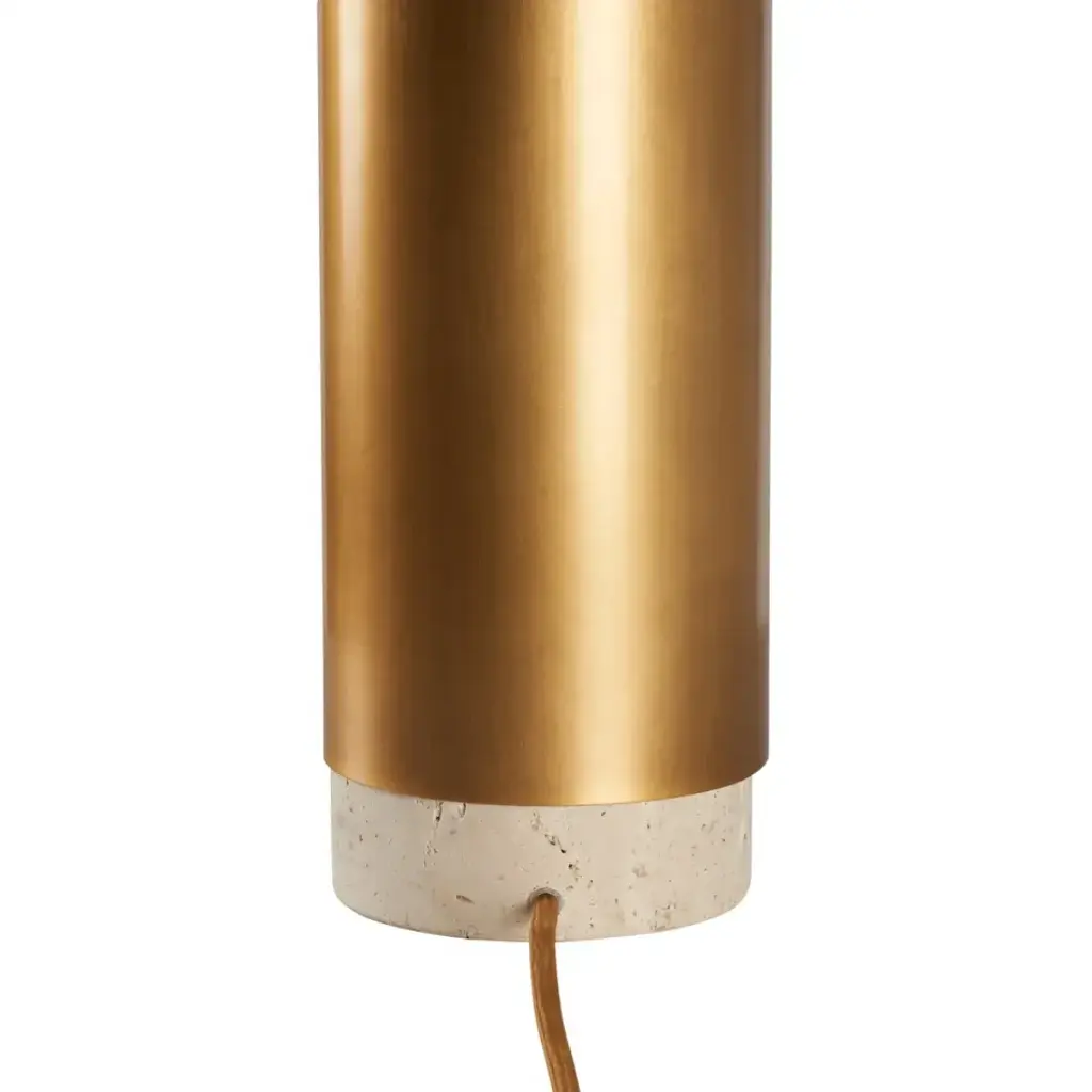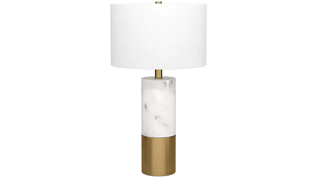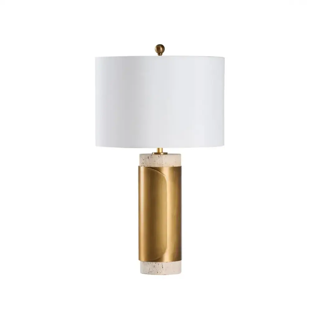 The Bridgeport Lamp - White brings timeless elegance to any setting with its refined combination of natural travertine and antique brass. The sculptural brass wrap adds a contemporary edge to the warm, textured stone base, while the clean white drum shade offers a soft, ambient glow.