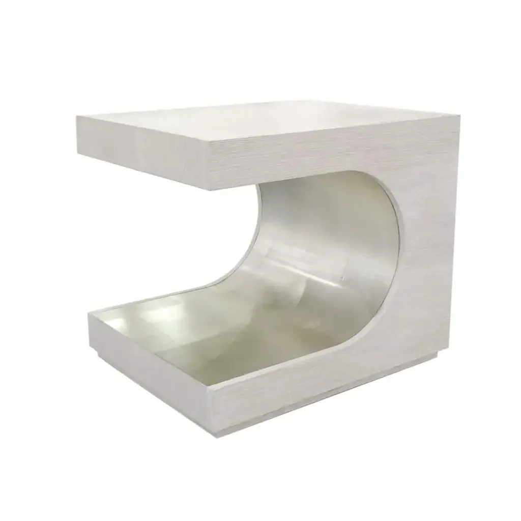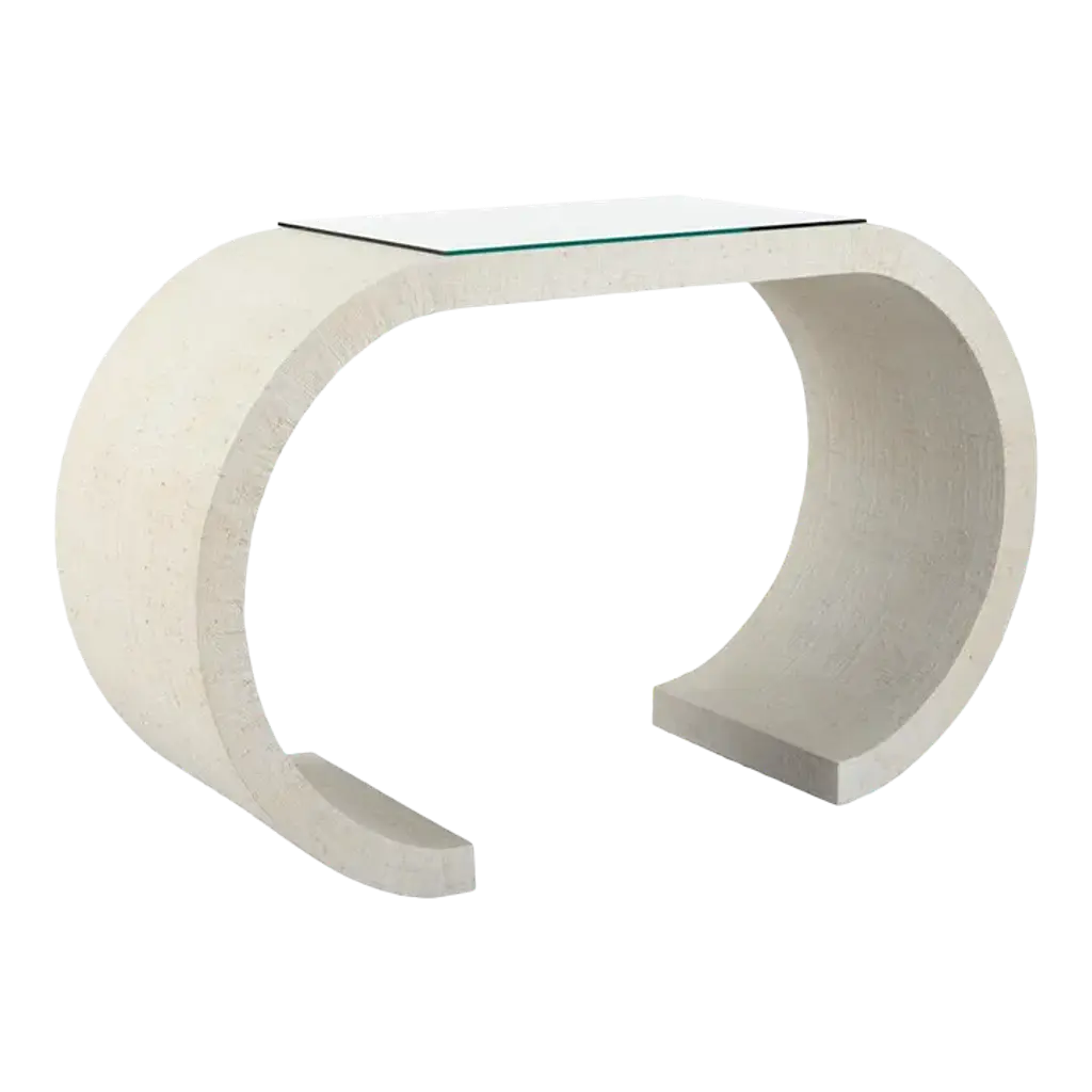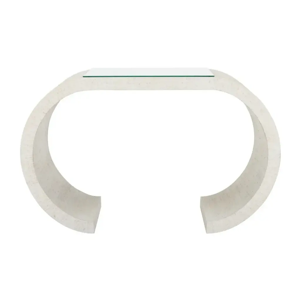 The Bridgers Console's striking design brings a big impact in a small, scaled piece. The shapely rounded arched legs and grass cloth wrapped body finished in white create an eye-catching piece for a small entry room or wall. Designed by Bill Cain.