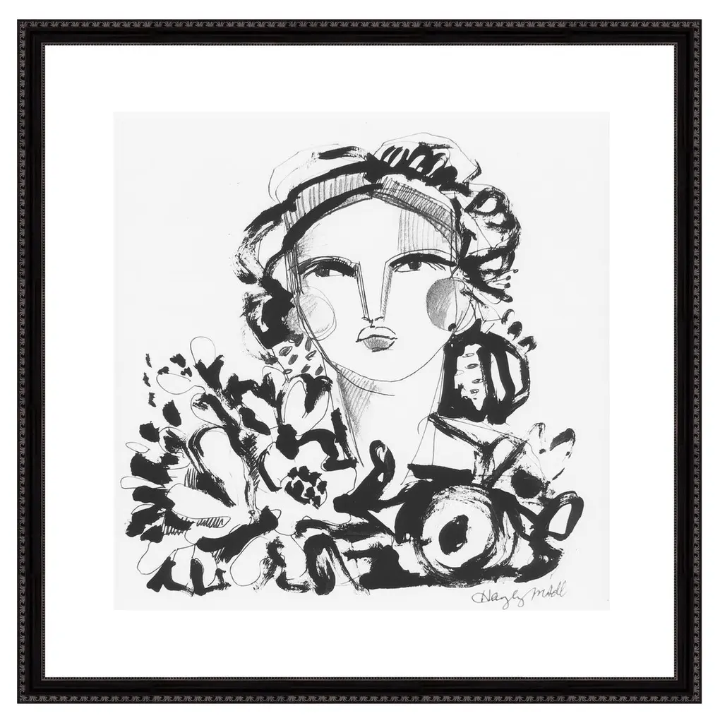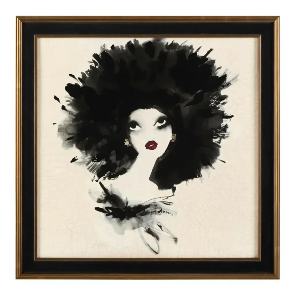 Dazzle by fashion illustrator Bridget Davies is a playful piece created from ink on watercolor paper. This stylish work of art is displayed from within a gold and black gallery frame.