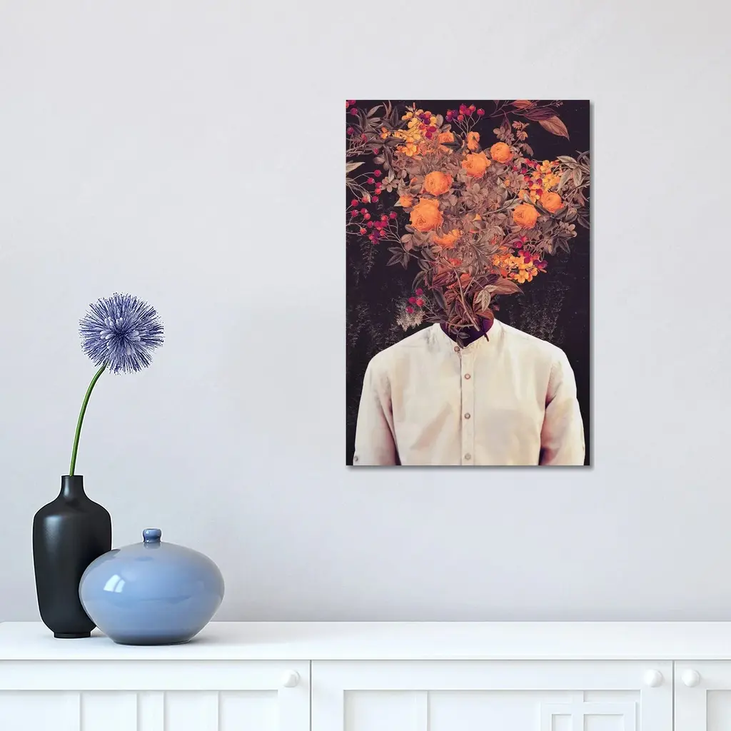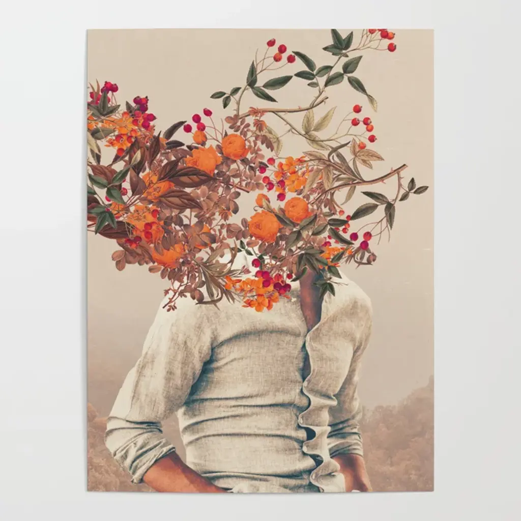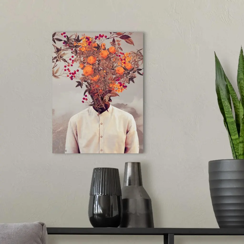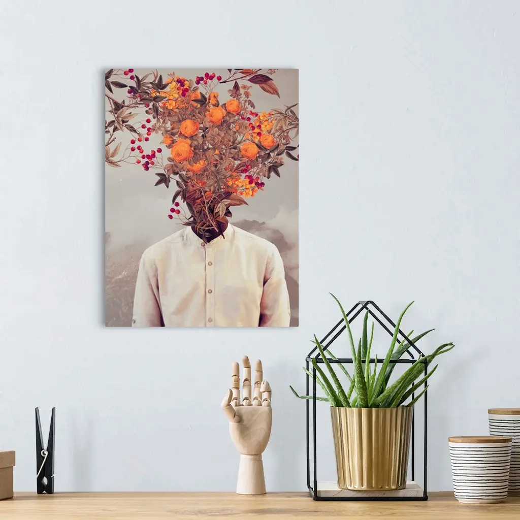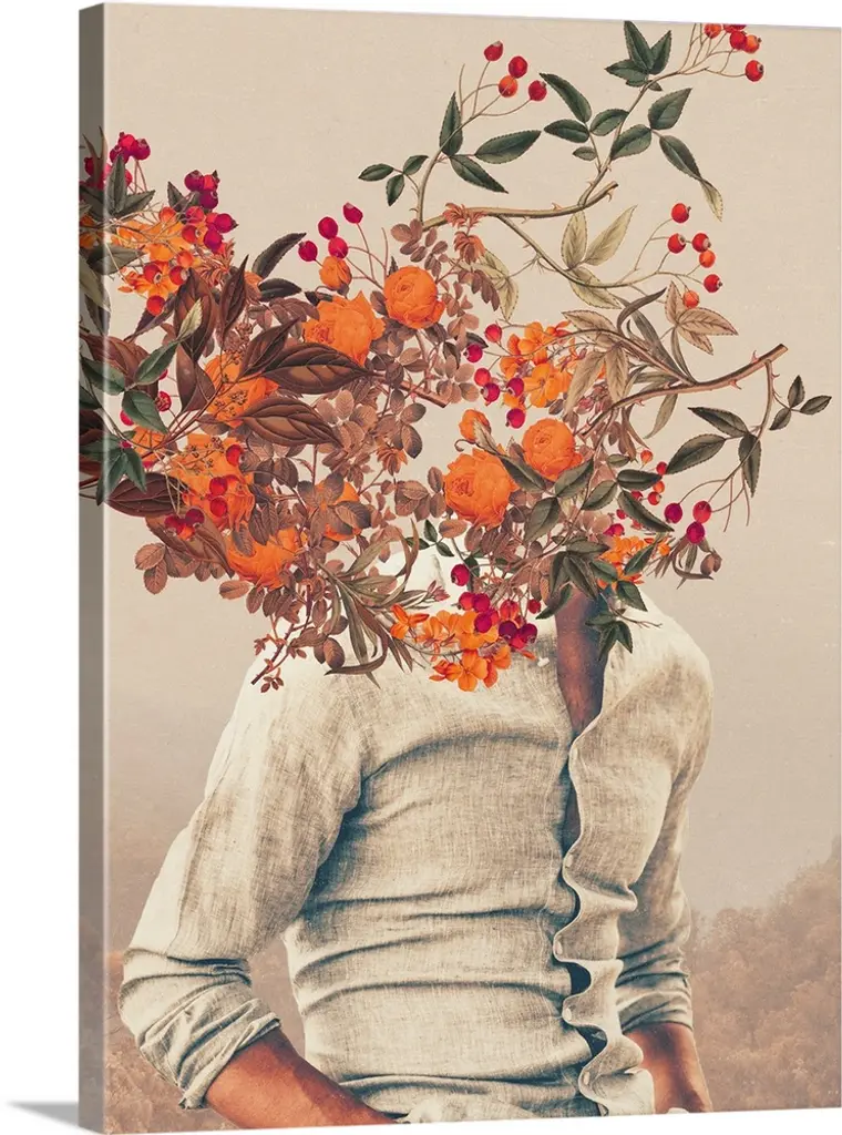 A high impact surrealist collage portrait of a person in a white shirt whose head is completely covered with orange roses and other foliage.