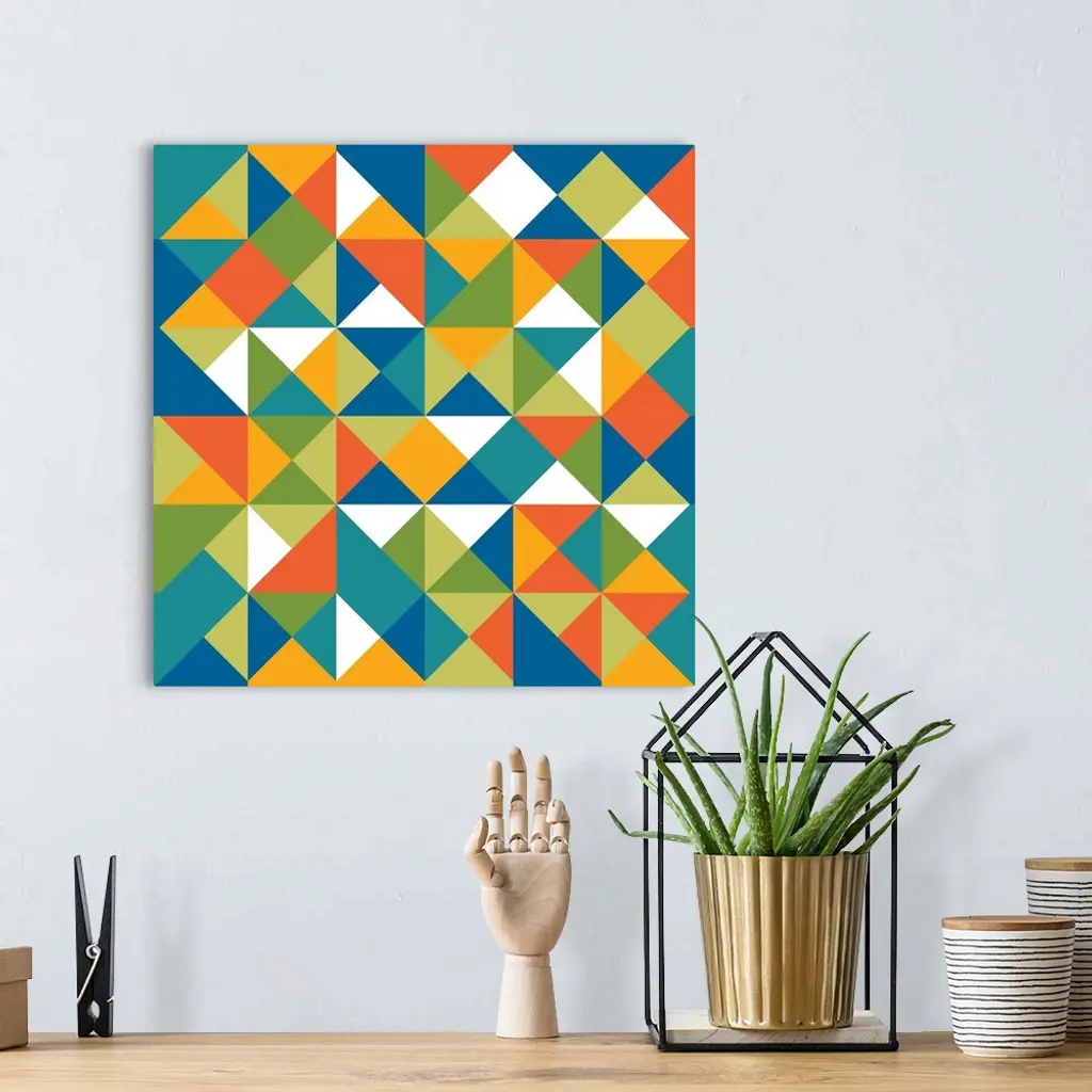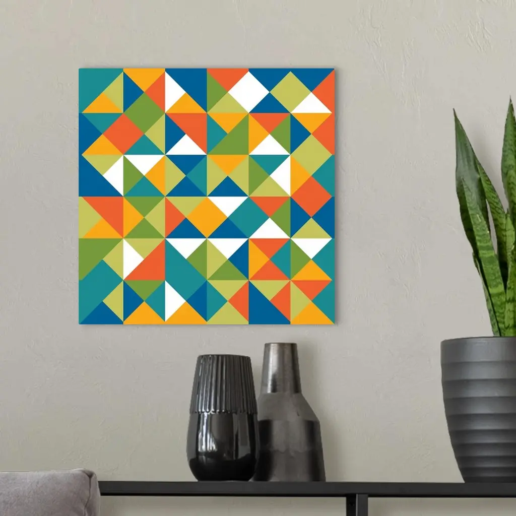 Square geometric art with a triangular pattern in shades of blue, green, orange, yellow, and white.