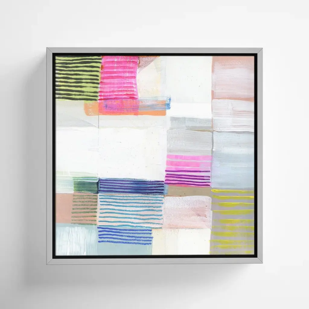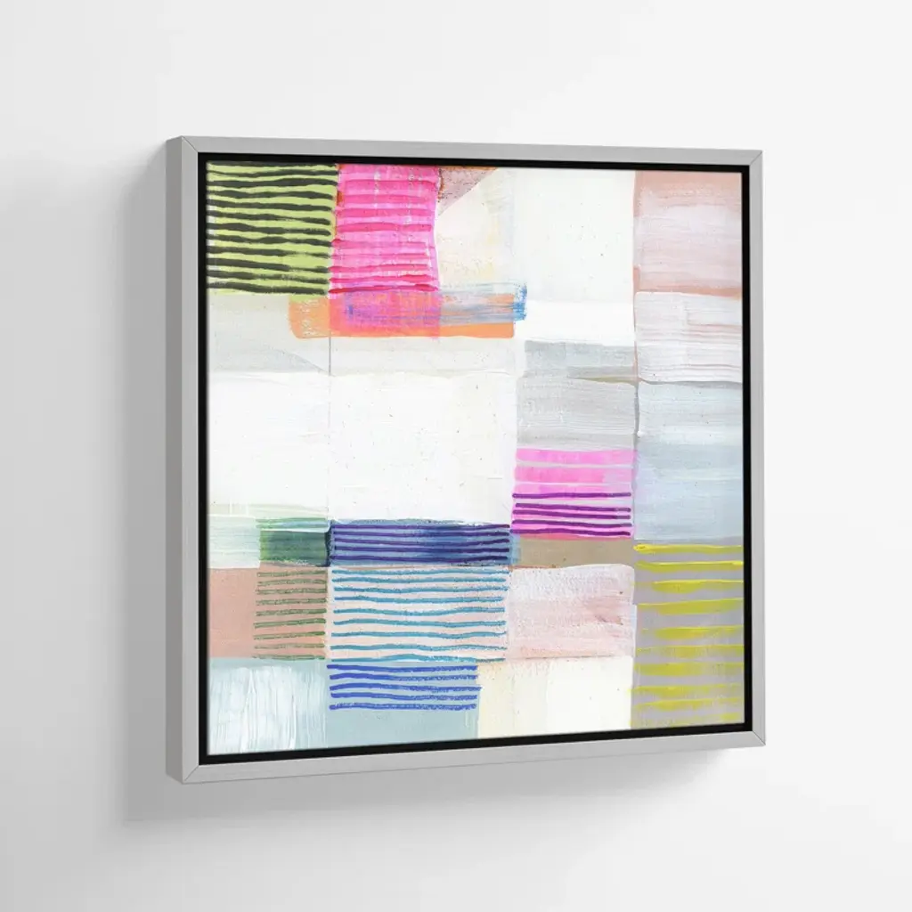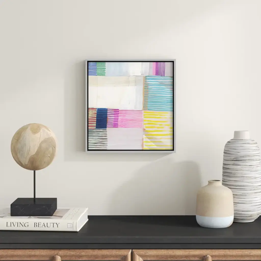 With its array of bright colors and textures, this abstract wall art instantly brightens and enlivens spaces of all styles. Printed on acid-free cotton blend canvas for fade-resistant, long-lasting clarity, this archival fine art giclee print is created with gallery-quality inks. It's gallery-wrapped over FSC-certified pine wood stretcher bars and is accented by a solid wood floater frame. Hand-stretched and made to order in the USA, this wall art even comes with hanging hardware for easy and secure installation, straight out of the box. Plus, it's offered in a wide variety of size and frame color options.