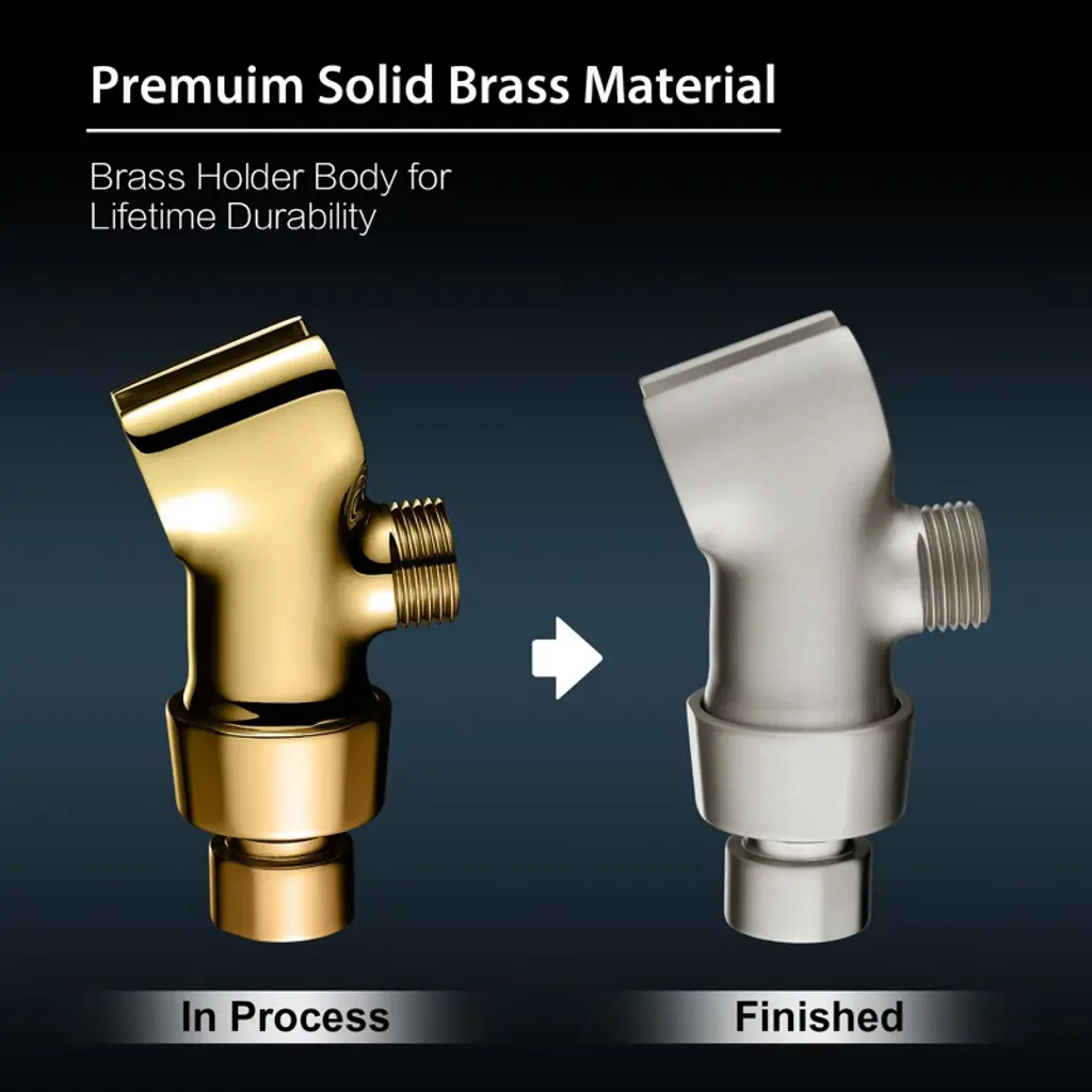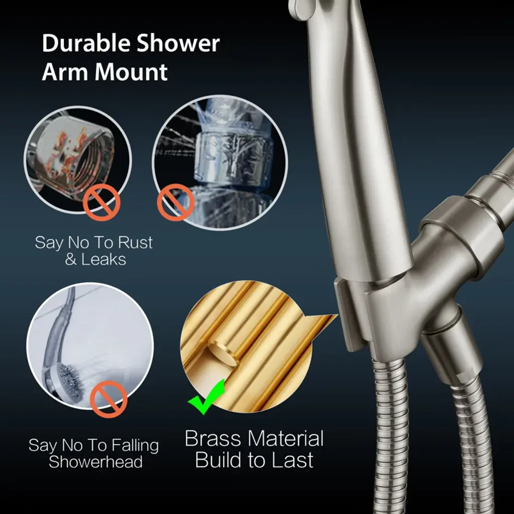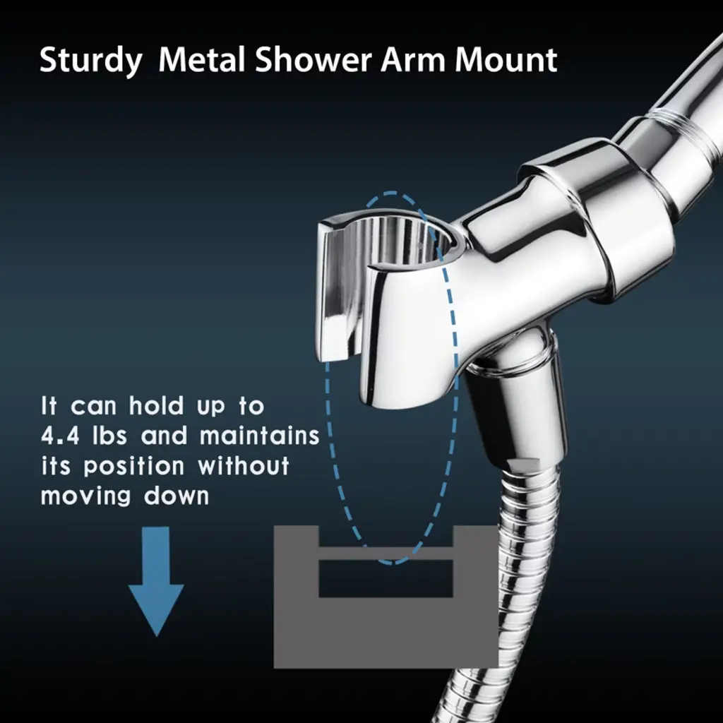 1. Durable All-Metal Construction – Crafted from premium all-metal materials with a solid brass swivel ball joint, this handheld shower head holder is built for long-lasting durability, heat resistance, and high water pressure performance. 2. 360° Adjustable Shower Angle – Features a brass pivot ball joint for smooth rotation, allowing easy angle adjustment to suit standing showers, seated use, or pet bathing. 3. Universal Wall Mount Compatibility – Fits most handheld shower head models with standard G1/2" connections and hose connector diameters from 0.75" to 0.89". Installs securely on standard shower arms. 4. Rust-Resistant Finish – Corrosion- and fade-resistant surface maintains its sleek look over time, enhancing both modern and traditional bathroom styles. 5. Quick, Tool-Free Installation – Standard 1/2" female inlet and male outlet ensure easy setup. Includes rubber gaskets for a secure, leak-free seal.Durable All-Metal Build: Made of premium all metal with a solid brass pivot ball, this handheld shower head holder offers excellent durability, heat resistance, and pressure resistance. A strong upgrade from plastic holders, built to last for years of daily use. 360° Angle Adjustment: The 360 degree adjustable shower head holder features a brass swivel ball joint that allows smooth rotation, so you can easily adjust the hand held shower head to your preferred angle. Whether you're standing, sitting, or washing pets, this shower wand holder adapts to your needs. Universal Wall Mount Fit: Engineered to fit most hand held shower head models, the tapered slot supports standard hose connector diameters from 0.75" to 0.89". Compatible with standard G1/2" shower arms and hoses, this shower head holder wall mount installs quickly and securely. Sleek Rust-Resistant Finish: The high-quality surface finish resists corrosion and fading while maintaining its sleek appearance over time. A refined addition to any bathroom, this shower wand holder wall mount complements modern or classic decor styles. Quick Tool-Free Setup: Installs in minutes with no tools required. Standard 1/2" female inlet and male outlet ensure compatibility, while included rubber gaskets help create a leak-free seal. A practical and stylish adjustable shower head holder for upgrading your shower setup.