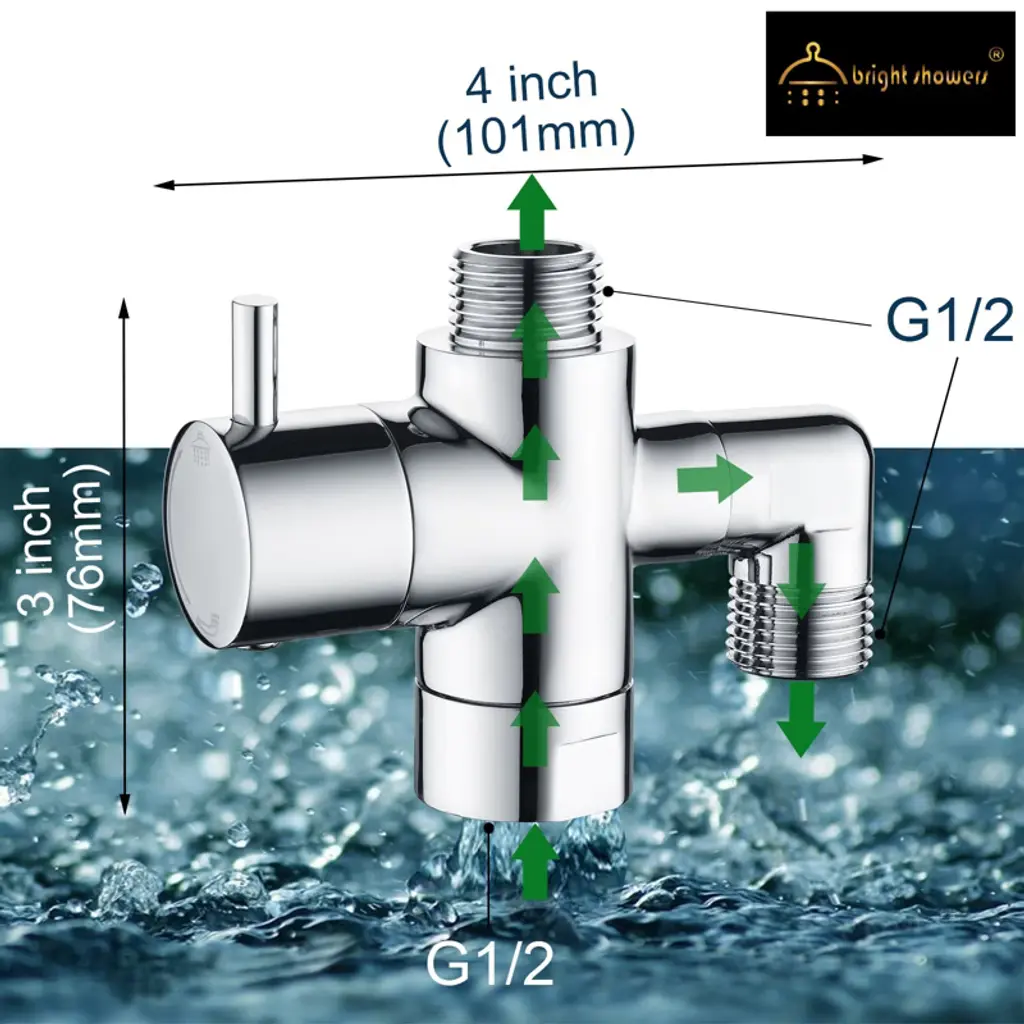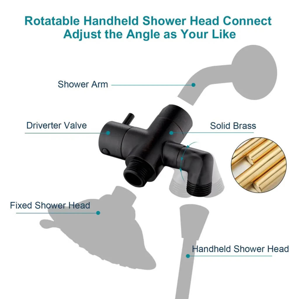 ALL BRASS DURABLE BODY -- The shower diverter valve is made of one-piece solid brass body construction which is durable, wear-resist, high-temp resist and pressure-resist. All metal material, you don’t need to worry about its stability any more 3 WAY SHOWER DIVERTER -- You just need to connects it to the shower arm, then you can simply divert the water to flow from the handheld or the rain shower, or both shower head at the same time but water flow is halved of each outlet and depends on your water pressure ROTATABLE HANDHELD SHOWER HEAD CONNECTOR -- Upgrade adjustable handheld shower connector solves the problem of the wrong angle of shower hose very well for most shower arm diverter, you can adjust the angle easily to keep the shower hose vertical and prevent it kinking during in your shower MODERN DESIGN -- Stylish shower arm diverter with high quality and beautiful surface finished will not fade or tarnish over time, fits most shower arms or bathroom attachments, also enhance the overall look of your bathroom EASY INSTALLATION & ANTI-LEAK -- 1 x G1/2 female inlet, 2 x G1/2 male outlet, standard thread connections, this shower arm diverter fits universal G1/2 handheld shower and fixed spray head connections. Solid brass slip nut which is easy for you to tighten the diverter valve in any position and adjust the angel, Rubber gaskets is for a better tight seal without leaking if install properly, FREE TEFLON TAPE is included
