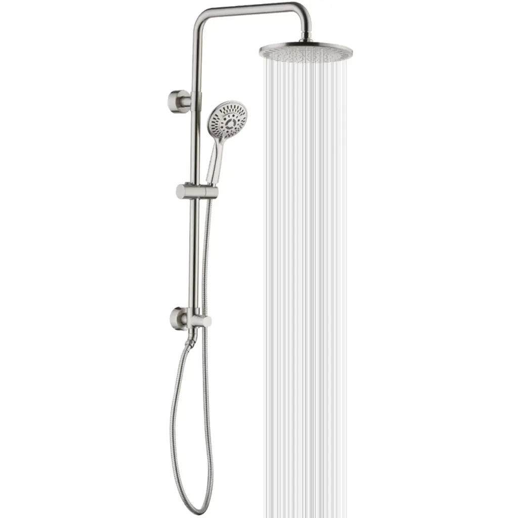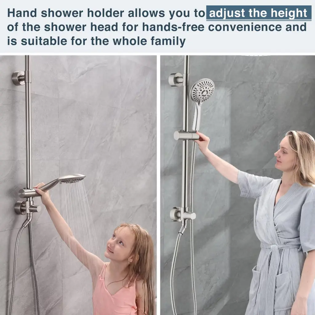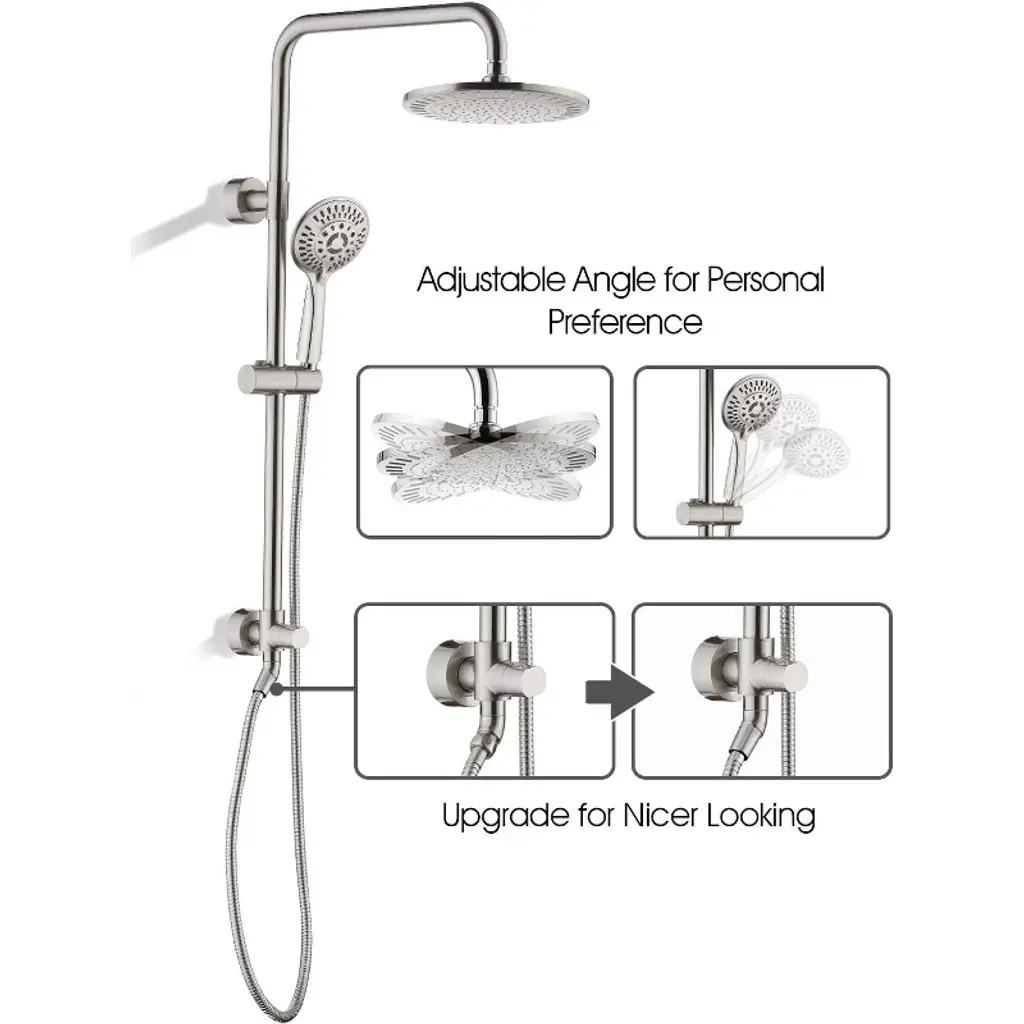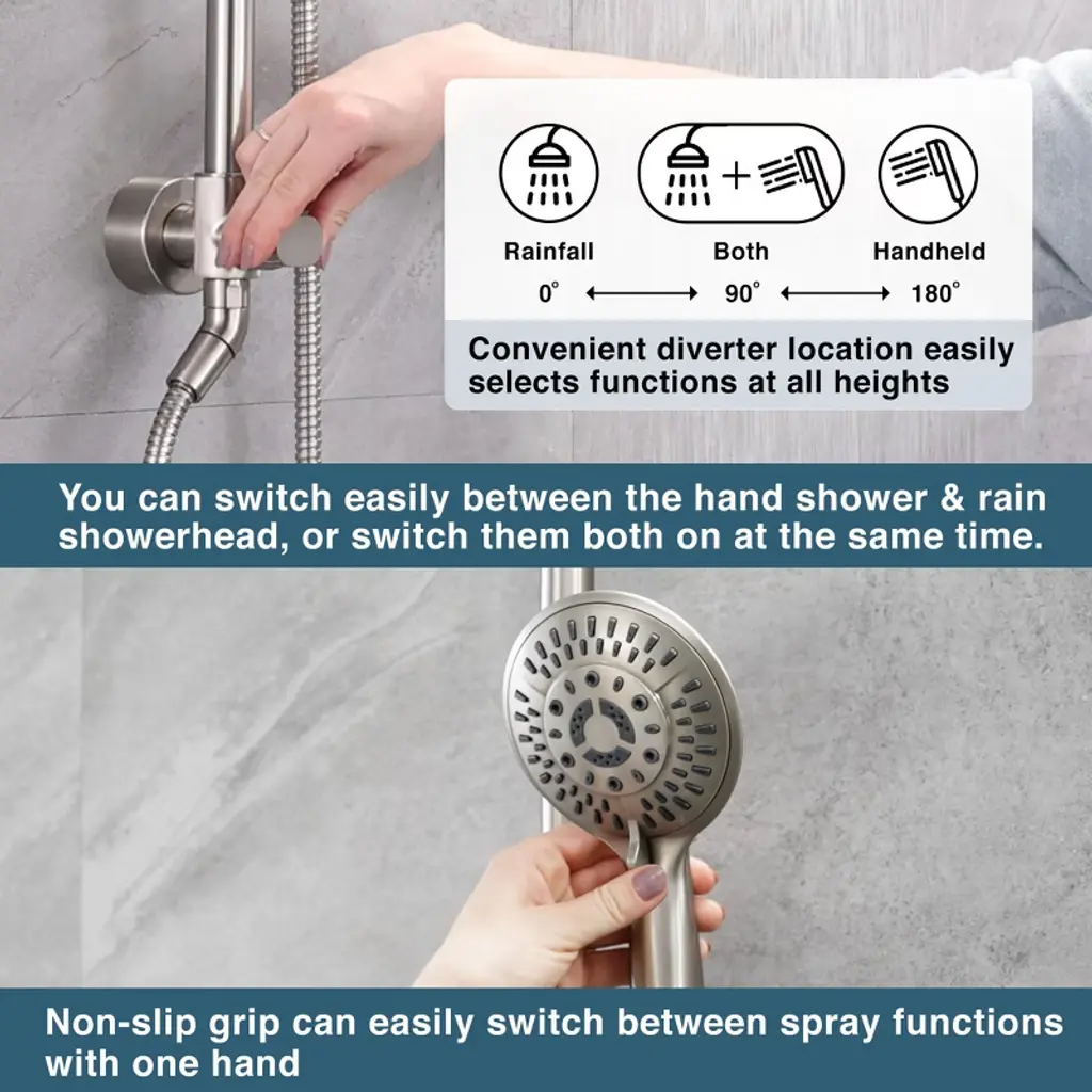 Sturdy Construction: Solid brass rail engineering with ABS plastic shower heads. Sturdy construction built to last. High standard brushed nickel finish that is easy to clean and maintain and has anti rust properties. Rainfall Shower Head: 9 Inch large overhead rain shower head with 200 jet nozzles to ensure full body coverage. The silicone rubber jet nozzles prevent the build-up of minerals. The adjustable swivel ball joint is made of solid brass which makes this rain shower head more durable. 5 Functional Spray Settings - Providing five spray modes for a variety of relaxing options; MASSAGE SPRAY, RAIN SPRAY, MIND BLOWING MISTY SPRAY, HIGH SPEED SPRAY, & PAUSE. The pause feature reduces the water to a trickle which is intended for lathering and Shaving without affecting the temperature settings. Height Adjustable Shower Head: The slider can easily be moved up and down to change the height of your handheld shower head which is convenient for kids or washing a pet. Diverter is located on the bottom of the shaft making it easier to reach for children and older. 5 FT Stainless Steel Hose: A durable and flexible shower hose that is made of a rust-proof stainless steel. The kink-free design helps you rotate the shower head freely and prevents the 60-inch long shower hose from kinking. 30 minute installation with your current in-wall plumbing, drilling free option is available, no need to break out tiles