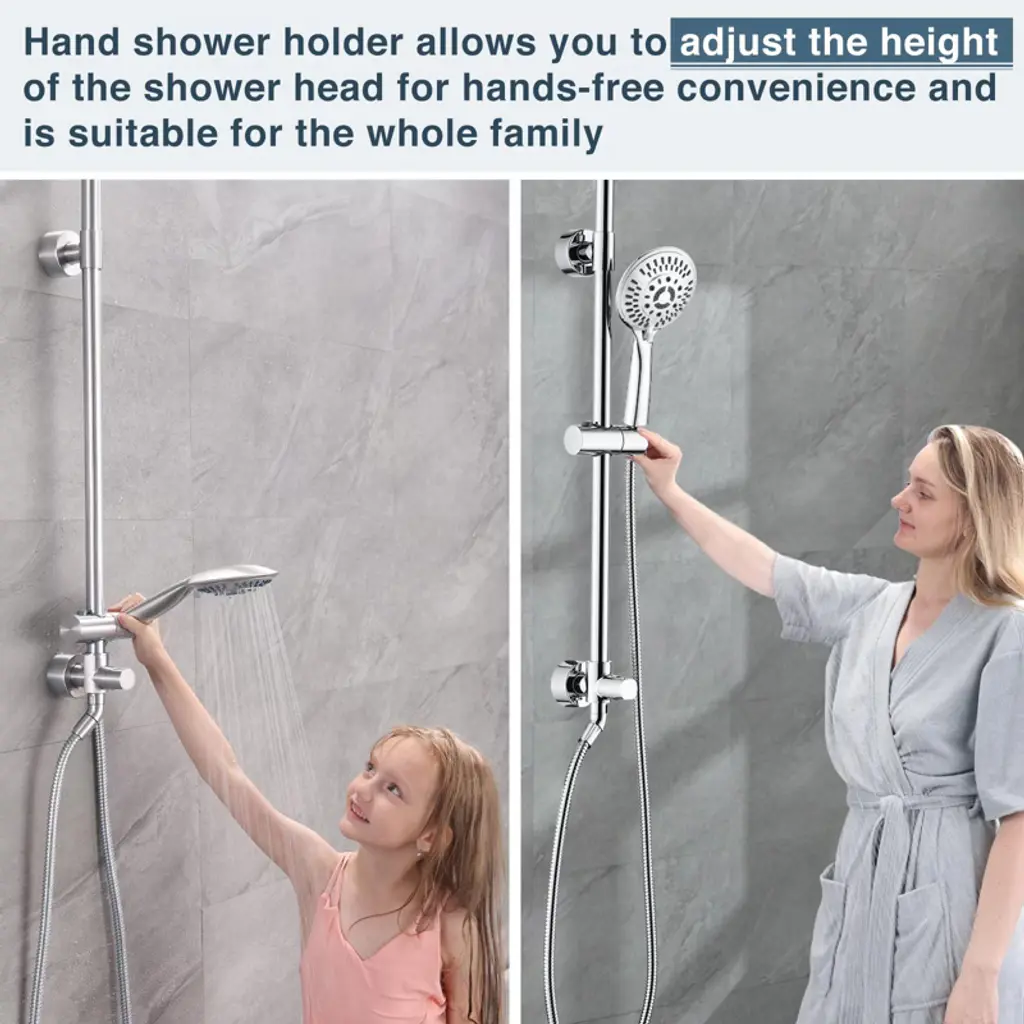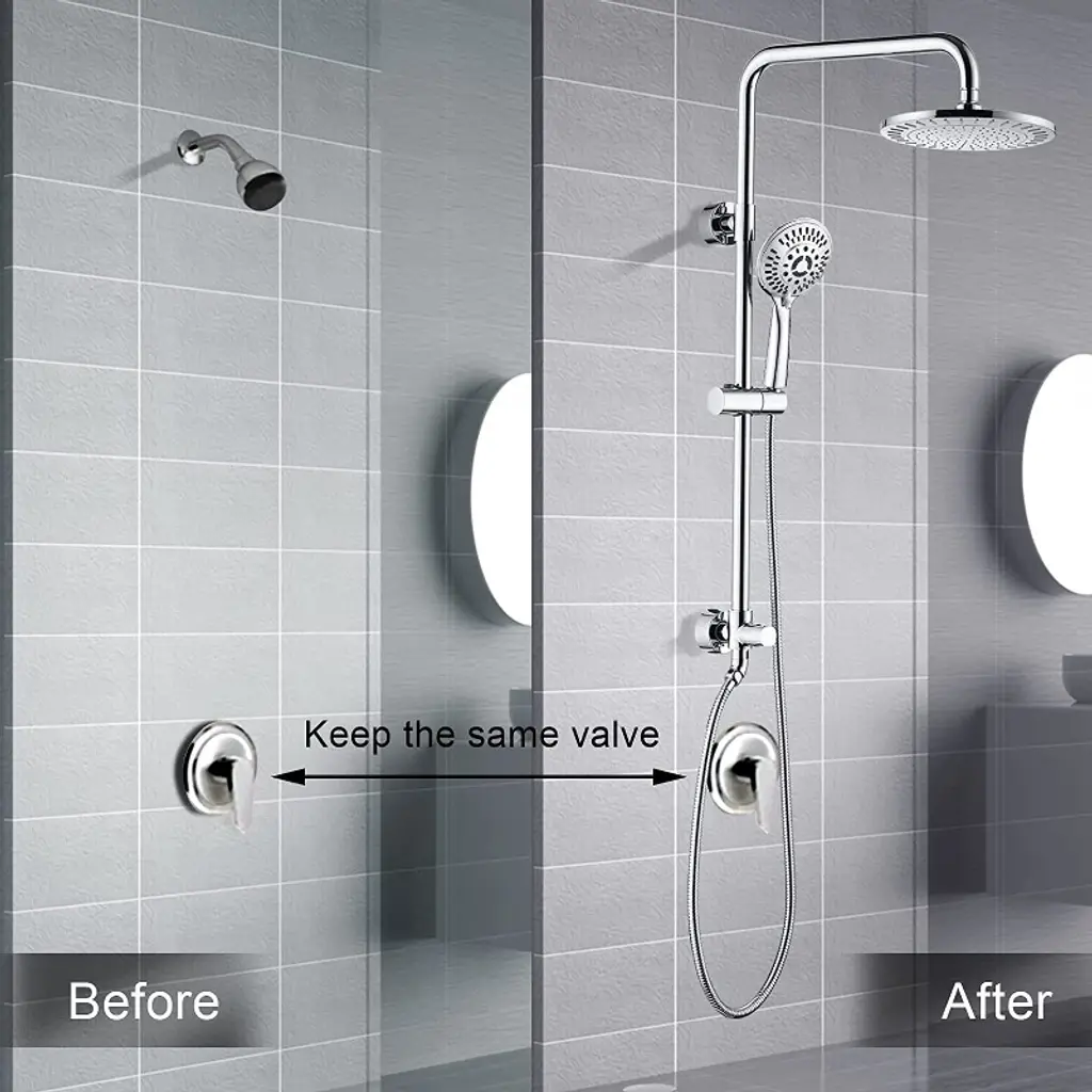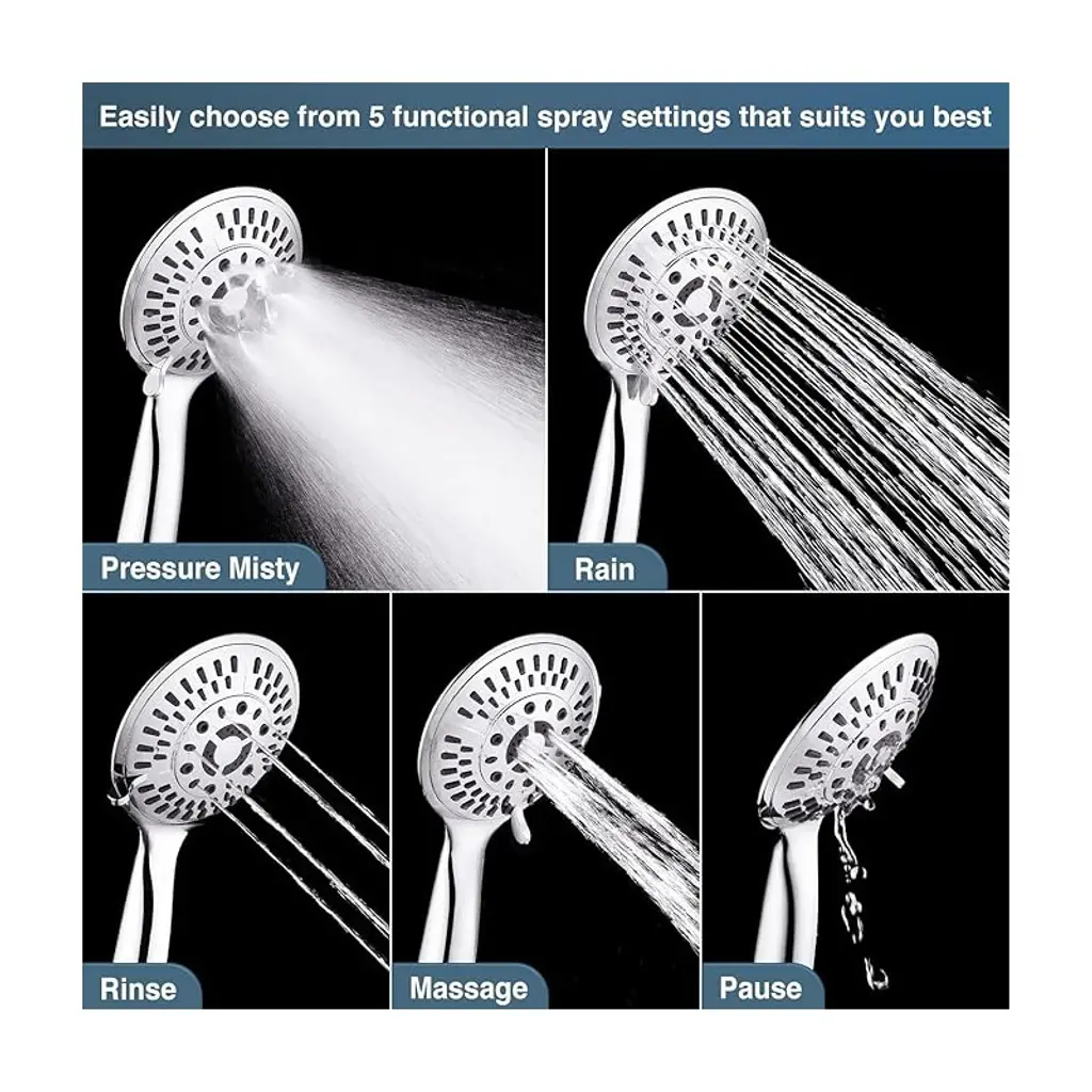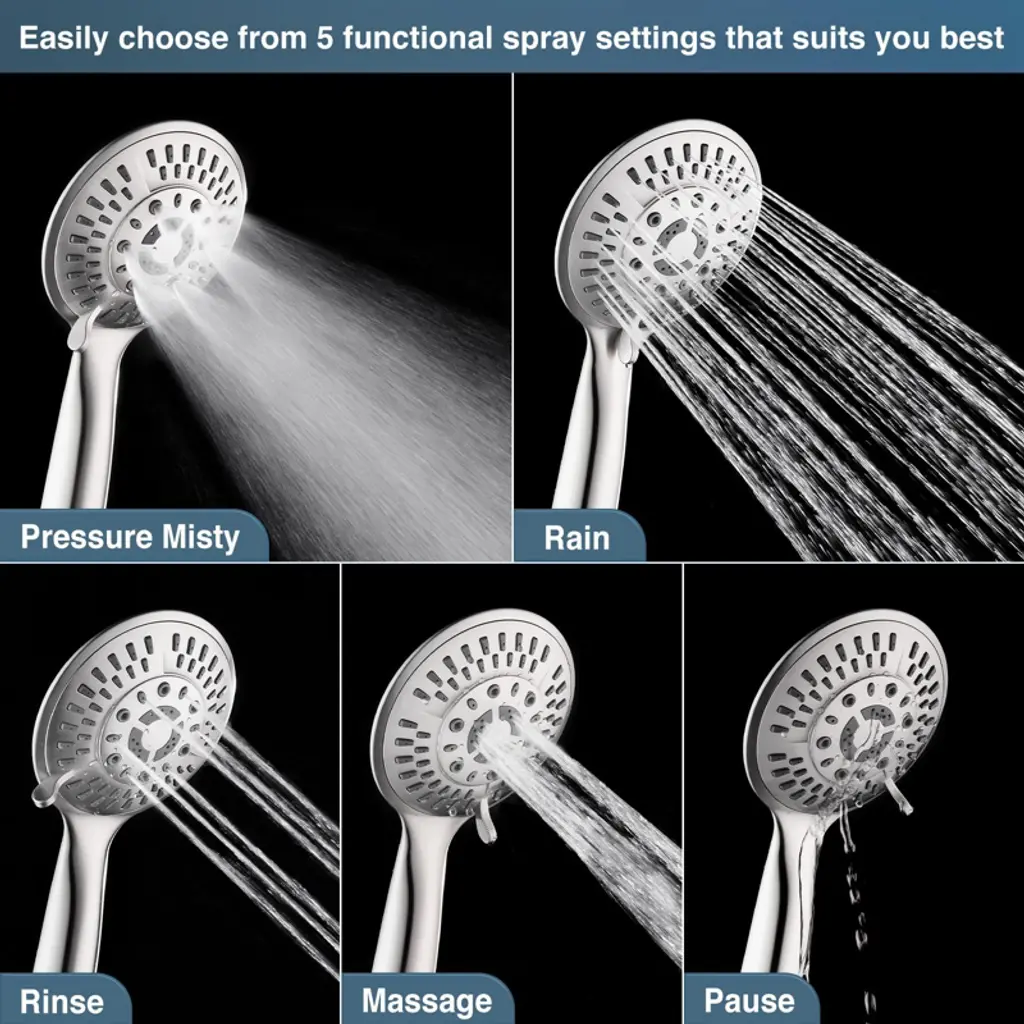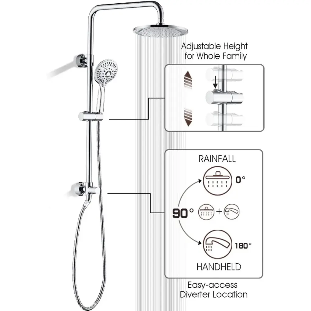 Sturdy Construction: Solid brass rail engineering with ABS plastic shower heads. Sturdy construction built to last. High standard brushed nickel finish that is easy to clean and maintain and has anti rust properties. Rainfall Shower Head: 9 Inch large overhead rain shower head with 200 jet nozzles to ensure full body coverage. The silicone rubber jet nozzles prevent the build-up of minerals. The adjustable swivel ball joint is made of solid brass which makes this rain shower head more durable. 5 Functional Spray Settings - Providing five spray modes for a variety of relaxing options; MASSAGE SPRAY, RAIN SPRAY, MIND BLOWING MISTY SPRAY, HIGH SPEED SPRAY, & PAUSE. The pause feature reduces the water to a trickle which is intended for lathering and Shaving without affecting the temperature settings. Height Adjustable Shower Head: The slider can easily be moved up and down to change the height of your handheld shower head which is convenient for kids or washing a pet. Diverter is located on the bottom of the shaft making it easier to reach for children and older. 5 FT Stainless Steel Hose: A durable and flexible shower hose that is made of a rust-proof stainless steel. The kink-free design helps you rotate the shower head freely and prevents the 60-inch long shower hose from kinking. 30 minute installation with your current in-wall plumbing, drilling free option is available, no need to break out tiles