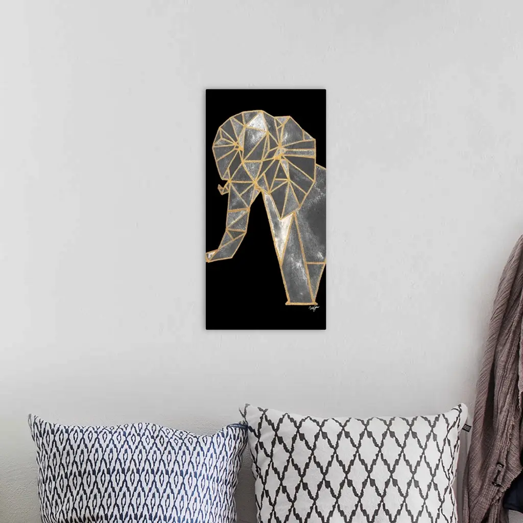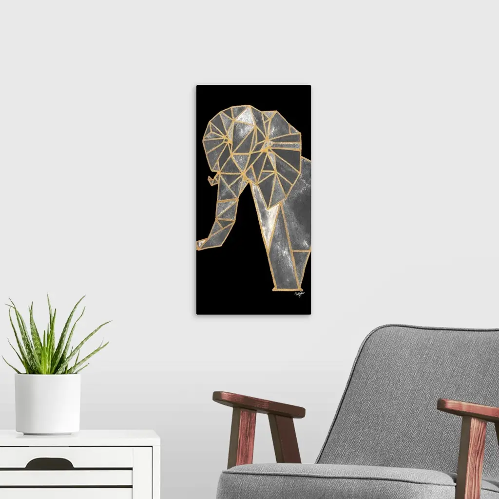 Abstract elephant created with metallic gold geometric shapes on a solid black background.