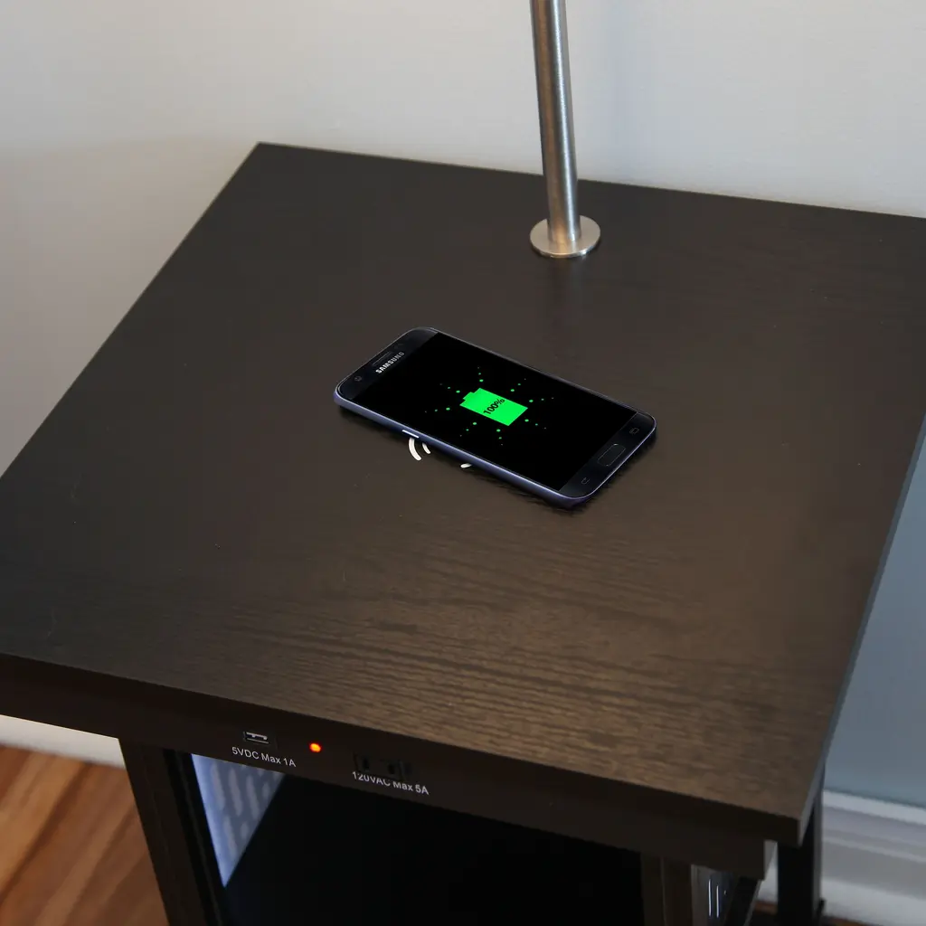 Brightech's Madison LED Floor Lamp is the perfect way to add style and convenience to your living room. This bundle set of two 4.7-foot lamps is an incredible value, offering two lamps for cheaper than purchasing them individually. Each lamp features a sleek, upscale design with a 12-inch diameter shade atop a shiny brass arm that slopes into a grain-finished wood table base. The arm swivels 360 degrees, allowing you to adjust the warm light to your comfort. The solid table top provides a place to rest a teacup, while two open-display tiers offer space to show off decorative arts, vases, books, and knick-knacks. Additionally, the Madison is equipped with two USB ports and a Qi-standard wireless charging pad, as well as an outlet for plugging in electronic devices such as tablets and laptops. The table surface measures 18 x 18 inches and the included Brightech Energy Saver LED Bulb draws just 9.5 watts and fits within a standard E26 base. This long-lasting LED bulb has 800 Lumens, a 3,000 Kelvin color temperature, and never overheats a room. LED lighting is energy-efficient and produces glare-free lighting for years, reducing your electricity costs every month. This bundle set of two Madison LED Floor Lamps comes with everything you need for assembly, and takes approximately 20 minutes. The floor lamps weigh 21.2 pounds each and should only be plugged into 120-volt outlets. Enjoy the convenience and style of two Madison LED Floor Lamps for a great value today!