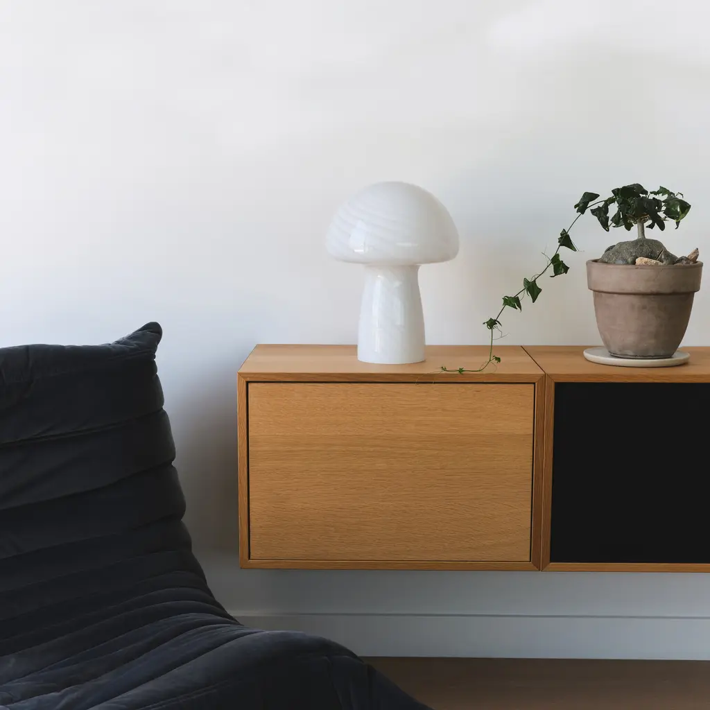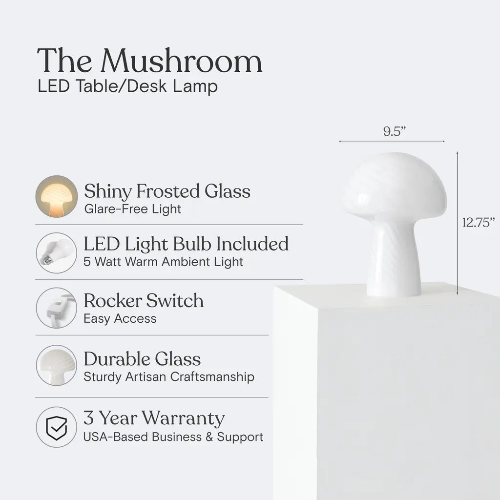 With a minimalist design that perches daintily on desks, side tables, the Mushroom lamp works perfectly on end or bedside tables. It's useful as a reading lamp or for ambient lighting in dorms, offices, and living rooms. It fits many types of décor, such as rustic, boho, contemporary, and eclectic design schemes and will be sure to have people taking a second look. Try the Brightech Mushroom Table Lamp when you want a great aesthetic without spending a lot of money. Its charming shape is accented by the subtle twist in the glass design, for an overall elegance that adds style to any space. The warm white light is diffused by the frosted glass for the perfect ambience in bedrooms, dorms, living rooms, and offices. With no assembly required, getting the lighting style you want with the Mushroom lamp is literally as simple as unpacking the box and choosing the perfect spot to plant it (pun intended!). With just a flip of the switch, your spaces will bloom. The Mushroom lamp is compatible with wall switches and smart plugs for added convenience and more versatile use! This Brightech LED table lamp comes with 5-watts of built-in LEDs that can burn for up to 20,000 hours - or 20 years at 3 hours per day. Our LED desk lamps can save you 90% on your electric bill in comparison to incandescent or halogen bulbs, and to top it all off they remain cool to the touch, making them a conveniently safer option as well. (Note- the bulb is not dimmable at this time.)