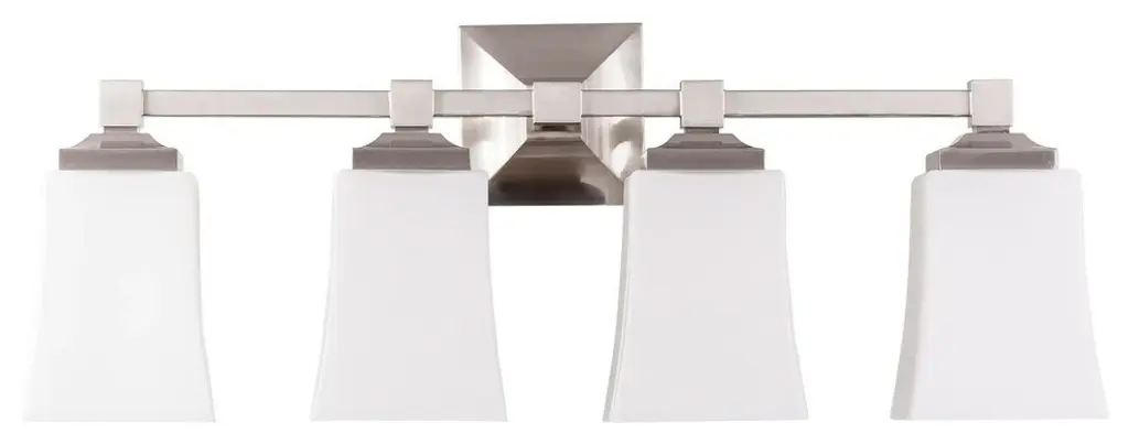 The Brighton vanity wall sconce, made by Linea di Liara, brings a touch of contemporary sophistication perfect for bathrooms, bedrooms, corridors, entryways and living areas.- 24.75" wide x 9.5" high, extends 6.75" from the wall. Backplate is 4.5" square. Features 6" high x 4.5" wide white glass shades- Features E26 sockets that are compatible with a variety of incandescent, LED, CFL and halogen bulbs (60W max, sold separately). Fully dimmable when used with dimmable bulbs and compatible dimmer switch- Features a universal mounting plate compatible with most 4" octagonal, round and square or 2" x 4" junction boxes (must be hardwired, installation by a licensed electrician recommended)- This Linea di Liara product is UL listed, and is backed by a 1 year limited manufacturer''s warranty