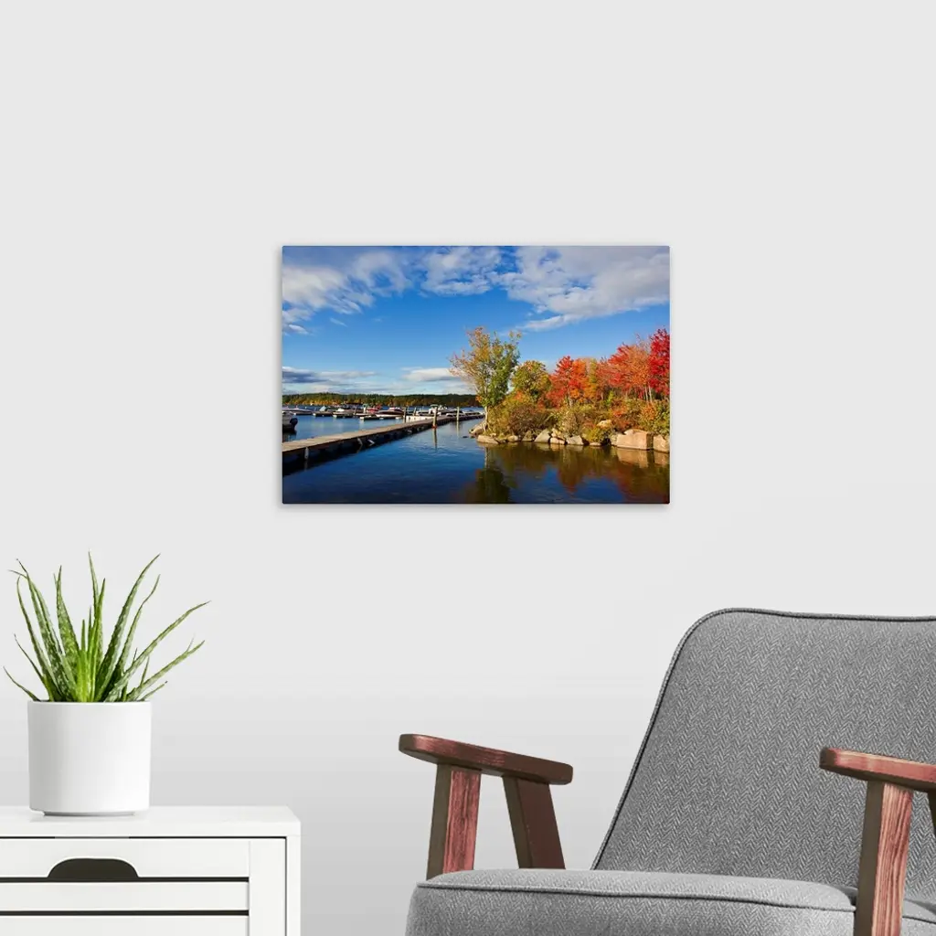 Brilliantly colored trees on a lake shore during autumn.