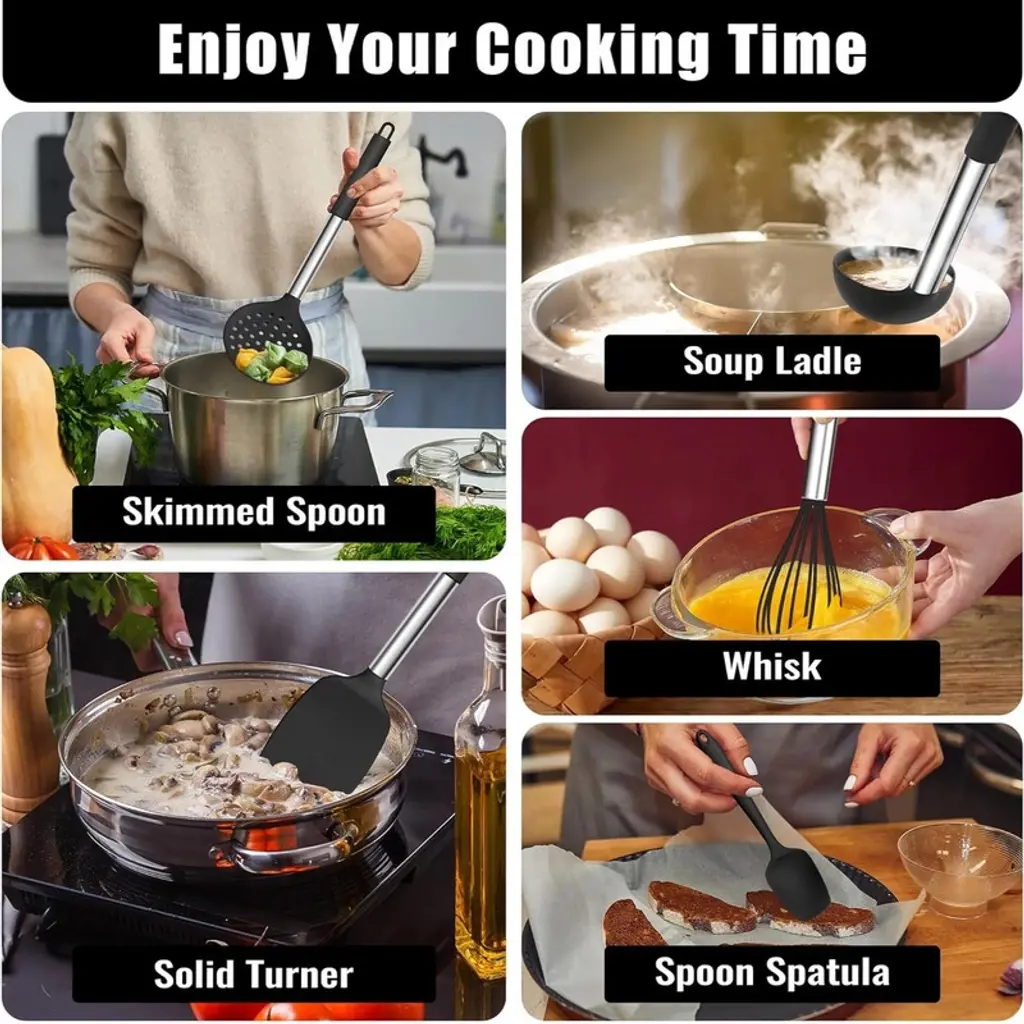 BRINJOY 14-Piece Silicone Kitchen Utensil Set offers a complete cooking solution with premium food-grade silicone construction. This comprehensive set includes essential tools: slotted spatula, ladle, spoon, whisk, tongs, basting brush, slotted spoon, spatula, scooping spatula, large spatula, canning spatula, pasta spatula, skimmer, and a plastic storage stand. The heat-resistant silicone withstands temperatures up to 200¡ãC while protecting your cookware from scratches. Designed for both functionality and convenience, each utensil features a sturdy steel handle with silicone insulation that reduces heat conduction. The hanging loops and included storage stand with drainage holes provide versatile storage options. Dishwasher safe and easy to clean, this set enhances your cooking experience while keeping your kitchen organized and efficient. Product Selling Points Food-Grade Heat Resistant Silicone Made from high-quality silicone that withstands temperatures up to 200¡ãC, non-toxic and odorless, ensuring no harmful substances leach into food during cooking. Insulated Steel Handle Design Features sturdy steel handles with silicone insulation that reduces heat conduction, providing comfortable grip and durability that outperforms wooden handles. Non-Scratch Cookware Protection Designed with soft silicone tips that protect nonstick pans and cookware from scratches, extending the life of your kitchenware while being dishwasher safe. Smart Storage Solutions Includes hanging loops on each tool and a plastic storage stand with drainage holes for quick drying, offering multiple space-saving storage options. Complete 14-Piece Kitchen Set Contains all essential utensils including spatulas, spoons, whisk, tongs, basting brush, and skimmer - perfect for cooking, baking, and food preparation.