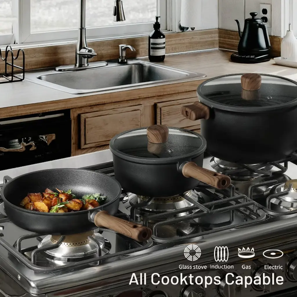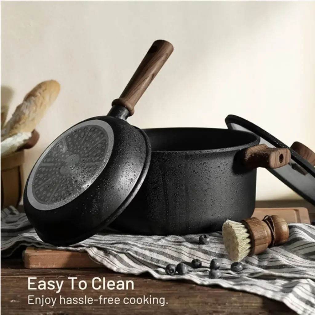 The BRINJOY 16-Piece Titanium Nonstick Cookware Set redefines durability and performance with its advanced titanium-reinforced nonstick coating, offering effortless food release and cleaning while remaining completely free from PFOS and PFOA. Crafted from reinforced die-cast aluminum, this comprehensive set ensures exceptional heat distribution and maintains its premium performance through years of frequent use. The set includes an 8-inch frying pan, 9.5-inch frying pan, 2.5-quart saucepan with lid, 5-quart sauté pan with lid, 5-quart stockpot with lid, colander, ladle, and five lid protectors—providing everything needed for versatile cooking tasks from poaching and simmering to reheating and frying. Designed for modern kitchens, this induction-compatible set heats quickly and evenly without hot spots, while the high-quality silicone lids create a secure seal that locks in flavor and enhances heat retention. The smooth titanium surface resists stains and odor buildup, ensuring a consistently clean cooking experience. Perfect for health-conscious families, this sleek black set combines professional-grade functionality with everyday convenience, making it an ideal choice for those who demand both superior nonstick performance and long-lasting durability. Product Selling Points Titanium-Reinforced Nonstick Coating Advanced titanium-enhanced surface provides superior durability and effortless food release, completely free from PFOS and PFOA chemicals. Reinforced Die-Cast Aluminum Construction Heavy-duty die-cast aluminum ensures even heating, prevents warping, and maintains performance through years of frequent use. Complete 16-Piece Kitchen Solution Includes frying pans, saucepan, sauté pan, stockpot with lids, colander, ladle, and protectors for all cooking needs. Induction-Compatible Even Heating Works on all stovetops including induction, with rapid, uniform heating that prevents hot spots for perfect cooking results. Flavor-Locking Silicone Lids High-quality silicone lids create airtight seals to lock in moisture, flavor, and heat for enhanced cooking performance.