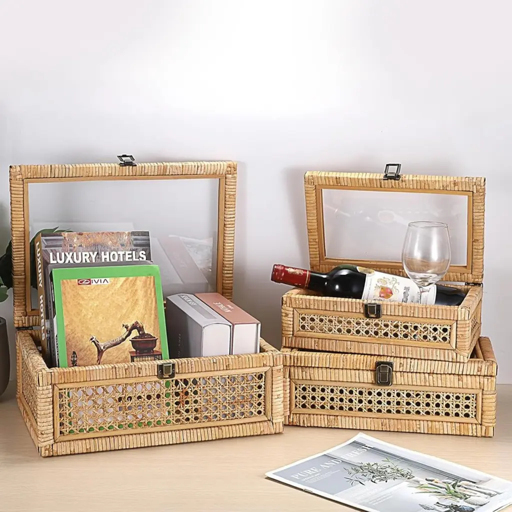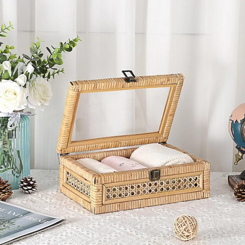 This elegantly crafted rectangular rattan display box combines vintage charm with modern functionality, featuring a secure metal clasp and clear viewing lid. Measuring 11"L x 7.1"W x 4"H externally (9.6"L x 5.7"W x 2.8"H internally), this handwoven box is constructed from natural rattan with a solid wood frame, ensuring durability while showcasing organic texture and rustic appeal. The transparent lid allows easy visibility of contents like snacks, remotes, or keepsakes while protecting them from dust, and the vintage-inspired metal clasp ensures secure closure during transport. Perfect for shelves, coffee tables, or entryways, this multifunctional box adds bohemian elegance to any space while providing practical organization. Product Selling Points: Secure Metal Clasp Design Features a vintage-inspired metal clasp that ensures secure closure during movement and transport, preventing accidental spills or openings. Clear Visibility Lid The transparent lid allows full visibility of contents without opening, protecting items from dust while maintaining easy access and organization. Natural Woven Rattan Construction Crafted from premium natural rattan with a solid wood frame, offering durability and authentic rustic charm with unique textural variations. Compact 11x7.1x4 Inch Size Ideal dimensions for storing remotes, snacks, small essentials, or decorative items while fitting perfectly on shelves, tables, and consoles. Versatile Decorative & Functional Use Serves as both a decorative accent piece and practical storage solution for living rooms, bedrooms, or entryways with multi-style compatibility.