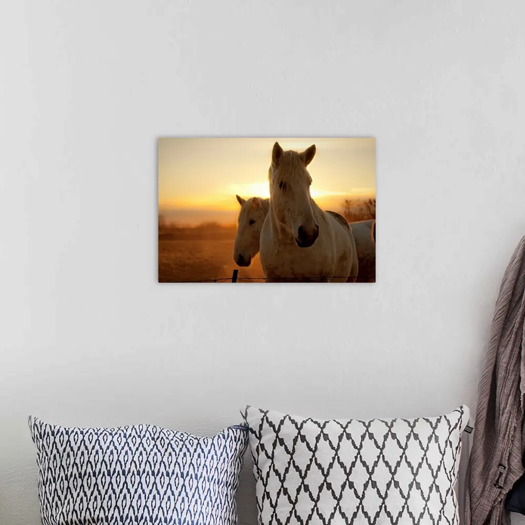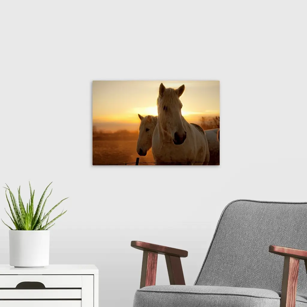 The early dawn light shines behind the manes of two white horses, already moving about their pasture at sunrise.
