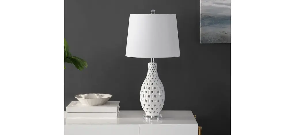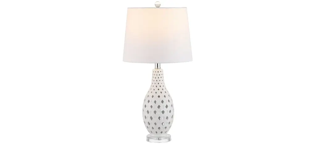 This Brisor Ceramic Table Lamp is a striking artistic statement fit for any interior. Clean white ceramic pierced with open diamond motifs emanates elegant decorative depth, and a crystal clear acrylic base and finial provide a subtle contemporary sparkle.
