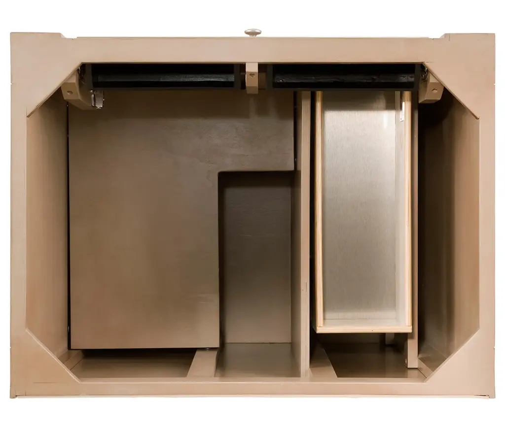 The Bristol 30" Whitewashed Walnut Vanity features a full plinth base, also known as a toe kick or pedestal base, This wraparound base allows for quick clean ups. This vanity is complimented by satin nickel door and drawer pulls, along with an optional wood backsplash.
