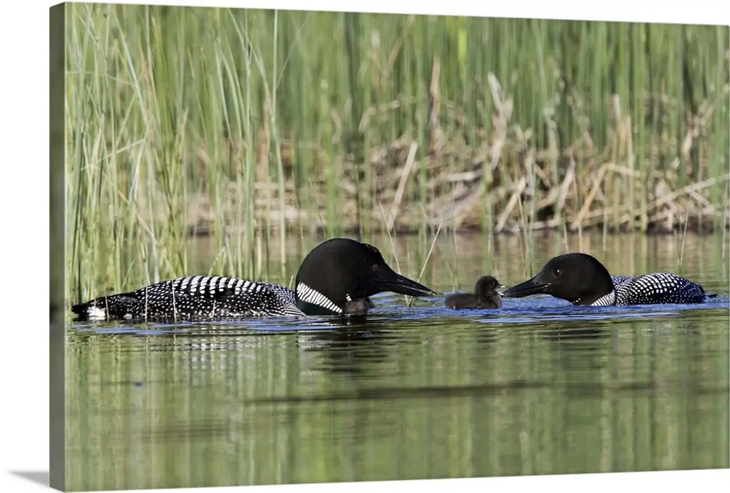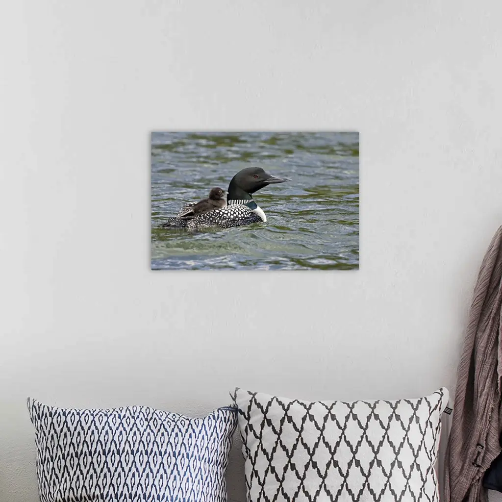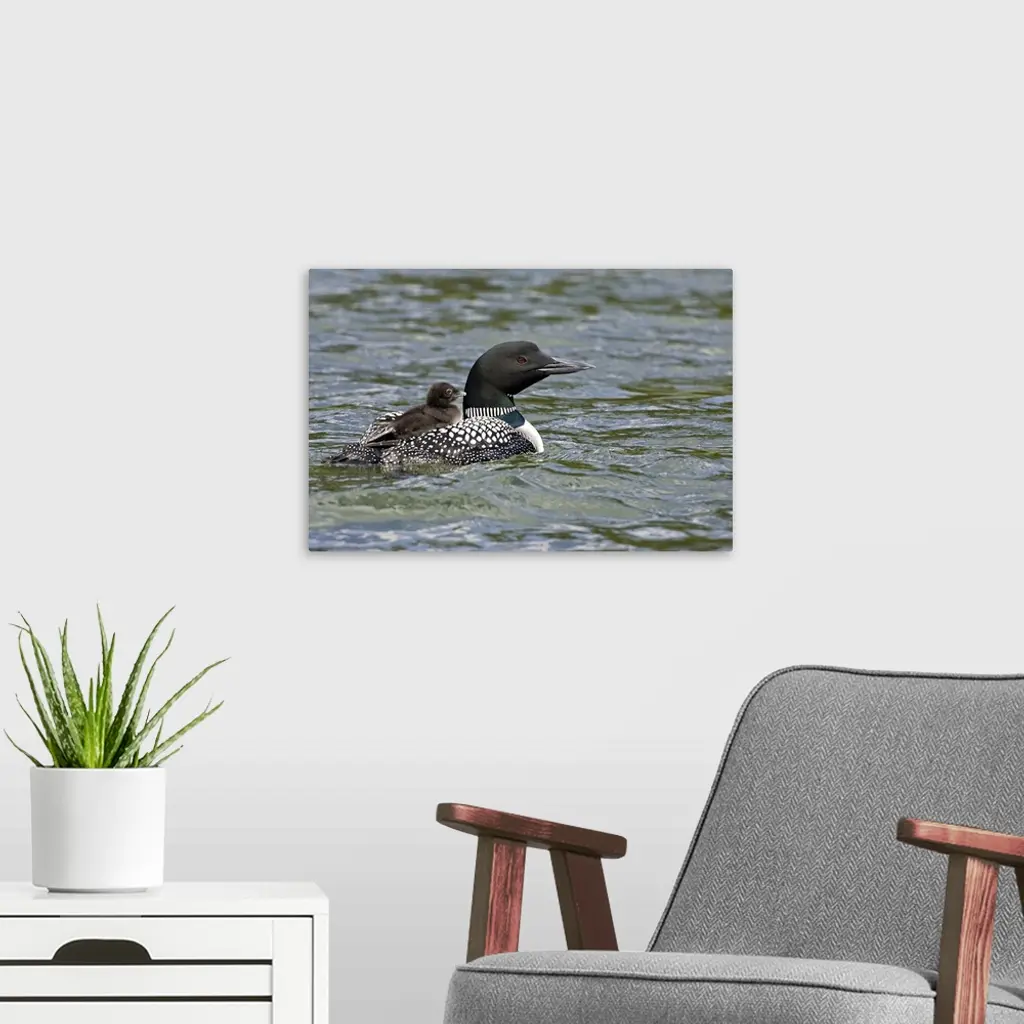 British Columbia, Lac Le Jeune, Common Loon Swimming With Chick On Back