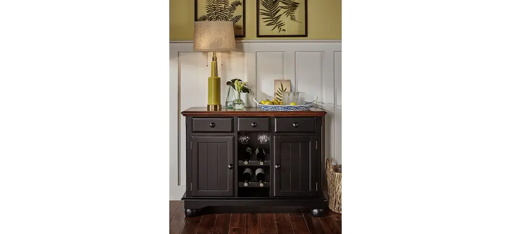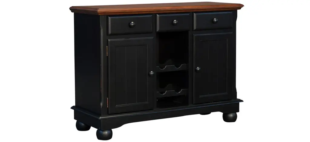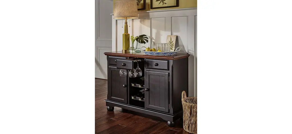 The British Isles server is constructed of solid Rubberwood and designed with traditional country appeal. This server provides ample hidden storage, along with wine storage for up to 4 bottles. The server's middle drawer is actually a wine glass rack that holds up to 6 glasses.